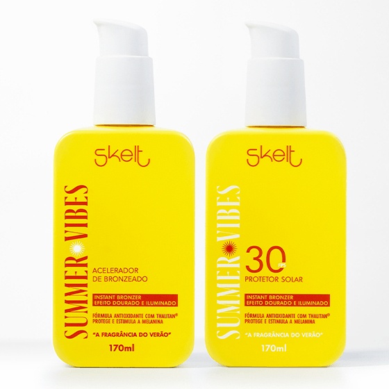 Descubra acombinação perfeita para um bronzeado duradouro e saudávelcom o Kit Summer Vibes FPS 30 - Acelerador de Bronzeado e Protetor Solar. É o melhor dos dois mundos: Um acelerador de bronzeado e um protetor solar, ambos enriquecidos comThalitan, um poderoso antioxidante que auxilia no tratamento da pele e naprevenção do envelhecimento, proporcionando um efeito iluminado. Acelerador de Bronzeado Summer Vibes:Intensifica a cor da pele, estimulando,acelerando e potencializando o bronzeado, sem causar vermelhidão. Sua fórmula promove uma pele saudável e radiante, enquanto afragrância exclusiva Summer Vibestraz a sensação de um verão inesquecível, com notas que evocam a liberdade da brisa do mar e o frescor da areia nos pés. Protetor Solar com Instant Bronzer FPS 30:Oferece o equilíbrio perfeito entre proteção e um bronzeado dourado. Comtoque seco e resistente à água, o Protetor Solar Instant Bronzer protege a pele enquanto potencializa o bronzeado. A fragrância Summer Vibes acrescenta um toque sensorial à experiência, evocando a energia e o frescor de dias ensolarados.