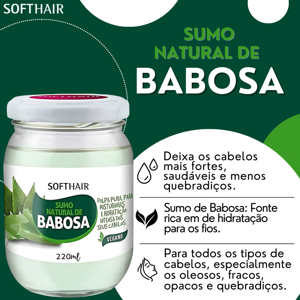 ENVIO IMEDIATO KIT SUMO DE BABOSA + BABA DE QUIABO 220ML SOFT HAIR A Babosa ou aloe vera é uma rica fonte de hidratação para os fios, por possuir muita água e minerais. Ela auxilia na produção de colágeno, tornando os cabelos mais fortes, saudáveis e menos quebradiços. O Sumo de Babosa Soft Hair, foi pensado pra facilitar a etapa de hidratação do cronograma capilar. O resultado são cabelos soltos, macios e com brilho intenso. A Baba de Quiabo é rica em minerais, sendo muito eficaz na hidratação intensa dos fios. Ela age na prevenção e combate de danos causados por chapinha, secador, baby liss e outros. Além disso, previne pontas duplas e promove mais brilho e maciez. - AUXILIA NA PRODUÇÃO DE COLÁGENO. - AUXILIA NO CONTROLE DA OLEOSIDADE EXCESSIVA DO FIO. - FORTALECE E REVITALIZA. - RICO EM VITAMINA E e COMPLEXO B. - HIDRATAÇÃO INTENSA E NUTRI OS FIOS. - PROMOVE O BRILHO E MACIEZ DOS CABELOS. - COMBATE DANOS POR CHAPINHA E MODELADORES DE CABELO. MODO DE USO: Seu uso pode ser feito sozinho no cabelo ou misturado à cremes e máscaras para potencializar o resultado. MISTURINHAS COM MÁSCARAS: Após a lavagem com Shampoo, adicione a quantidade desejada do Sumo de Babosa ao creme de sua preferência, deixe agir por 10 minutos, enxágue e condicione. Finalize como de costume. BABA DE QUIABO: Após a lavagem dos fios com o Shampoo Soft Hair de sua preferência, adicione a quantidade desejada da Baba de Quiabo ao creme de sua preferência, deixe agir por 10 minutos, enxágue e condicione. Finalize como de costume. ESSE ANÚNCIO CONTÉM: 01x Sumo De Babosa 220ml Soft Hair 01x Baba De Quiabo 220ml Soft Hair