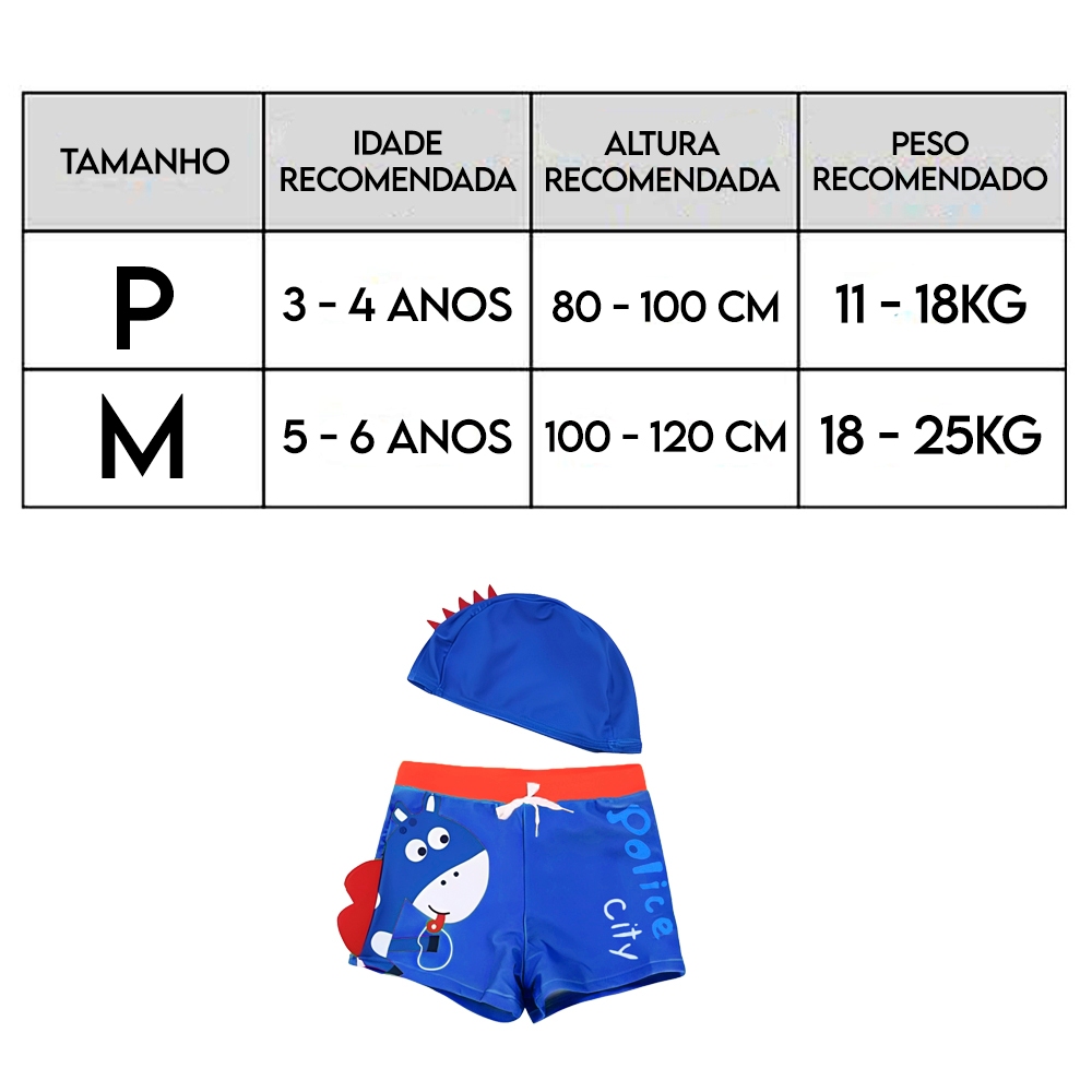 Kit Sunga Infantil + Touca Natação Piscina – Confortável, Estampada e Resistente Garanta mais conforto e diversão para os pequenos com este kit completo de sunga infantil + touca de natação! Perfeito para praia, piscina, escolinha, esportes aquáticos e dias de lazer. Tecido macio e resistente Secagem rápida Liberdade de movimentos Estampa moderna e super confortável Material: 82% POLIAMIDA 18% ELASTANO A sunga possui cós elástico e encaixe firme, oferecendo segurança e bem-estar durante o uso. Guia de medidas: Tamanho P Idade recomendada: 3 – 4 anos Altura recomendada: 80 - 100cm Peso recomendado: 11 - 18kg Tamanho M Idade recomendada: 5 – 6 anos Altura recomendada: 100 - 120 cm Peso recomendado: 18 - 25kg Acompanha touca de piscina, ideal para proteger o cabelo e facilitar a prática de natação. Contém: 1x Sunga 1x Touca Um kit prático, bonito e essencial para o dia a dia das crianças!