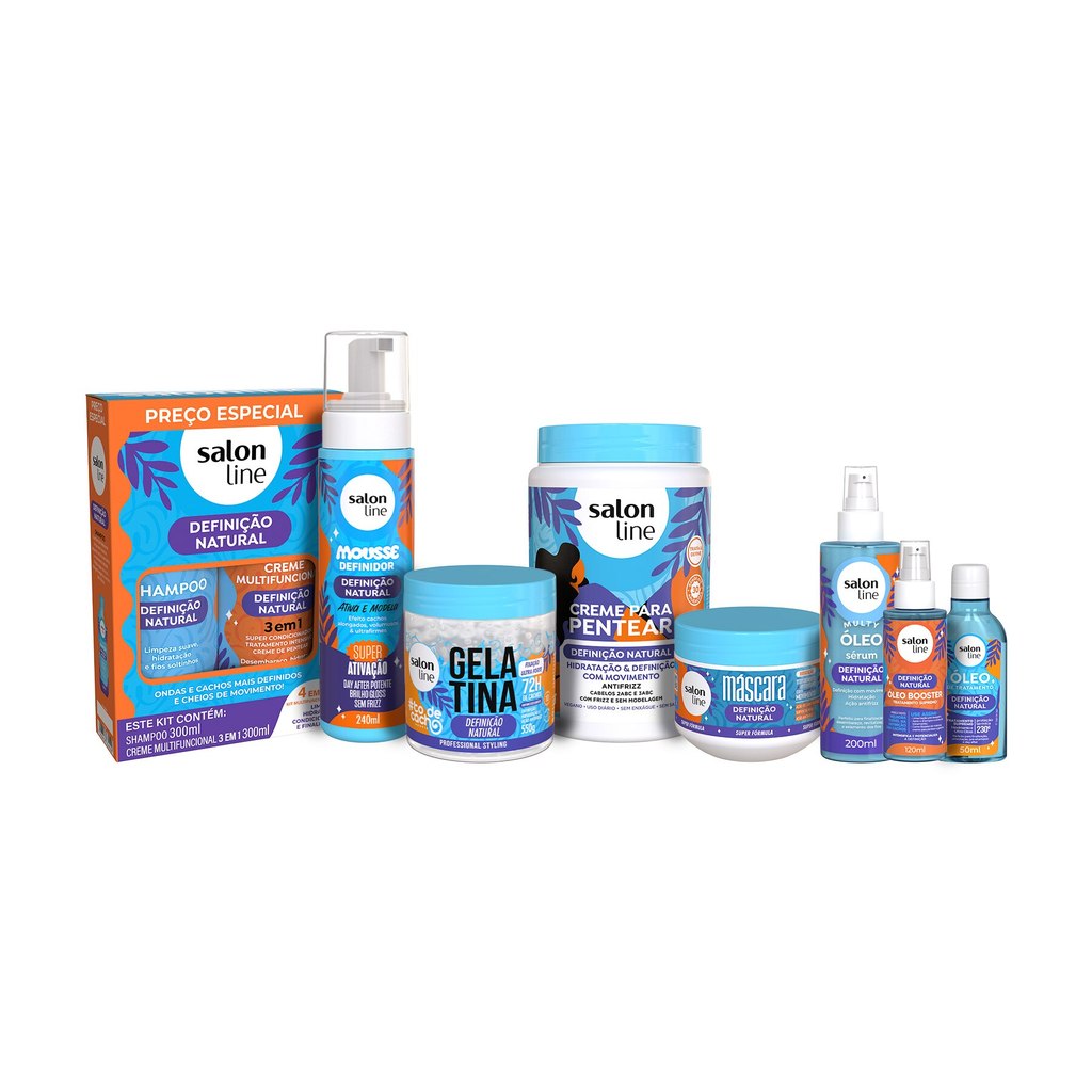 O kit contém 1 Kit Shampoo e Creme Multifuncional 300ml, 1 Creme para Pentear 1kg, 1 Gelatina 550g, 1 Óleo Sérum 200ml, 1 Óleo Booster 120ml, 1 Máscara de Tratamento 300g, 1 Óleo 50ml e 1 Mousse Definidor 240ml da linha Definição Natural. O Kit Super Definição Natural entrega o tratamento completo para os seus fios, garantindo limpeza suave, hidratação profunda e uma finalização perfeita com definição leve, controle do frizz e brilho extremo. <>INDICAÇÕES$& Para quais tipos de cabelo? Indicado para cabelos ondulados, cacheados e crespos. Qual a indicação? Para cabelos desidratados, sem forma, com frizz e para quem busca uma finalização com aspecto natural, maciez e muito balanço. Pode usar a partir de quantos anos? A partir de 12 anos. <>ATIVOS$& Quais os principais ativos? Shampoo, Creme Multifuncional, Máscara e Creme para Pentear Água de coco: potencializa a hidratação. Colágeno vegetal: auxilia na elasticidade e promove brilho. Extrato de hibisco: nutre e dá brilho intenso. Gelatina e Mousse Definidor Proporcionam definição flexível, ondas e cachos com movimento, garantindo formatação e fixação sem pesar. Óleos (Sérum, Booster e 50ml) Mix de óleos poderosos e ativos hidratantes que proporcionam nutrição extrema, selamento das cutículas, combate ao frizz e maciez aos fios. <>MODO DE USO$& Qual a melhor forma de usar? Kit Shampoo e Creme Multifuncional Aplique o shampoo no cabelo úmido, massageie e enxágue. Após lavar, aplique o creme multifuncional uniformemente no cabelo úmido. Deixe agir entre 1 e 3 minutos. Enxágue. Máscara de Tratamento Com os cabelos úmidos, aplique mecha por mecha, massageando da raiz para as pontas. Deixe agir de 3 a 5 minutos e enxágue bem. Creme para Pentear, Gelatina e Mousse Definidor Com os cabelos úmidos, aplique o produto mecha a mecha. Desembarace os fios com um pente de dentes largos e amasse-os das pontas até a raiz para ativar a curvatura. Não enxágue. Óleo Sérum, Óleo Booster e Óleo 50ml Com o cabelo seco ou úmido, aplique algumas gotas nas mãos e espalhe do comprimento às pontas. Pode ser usado misturado aos finalizadores ou sozinho para quebrar o durinho do creme, controlar o frizz e selar as pontas. Sem enxágue. <>CARACTERÍSTICAS$& É produto vegano? Apenas o Óleo Booster não é vegano. É liberado? Apenas o Creme para Pentear e a Gelatina Super Definição são liberados.