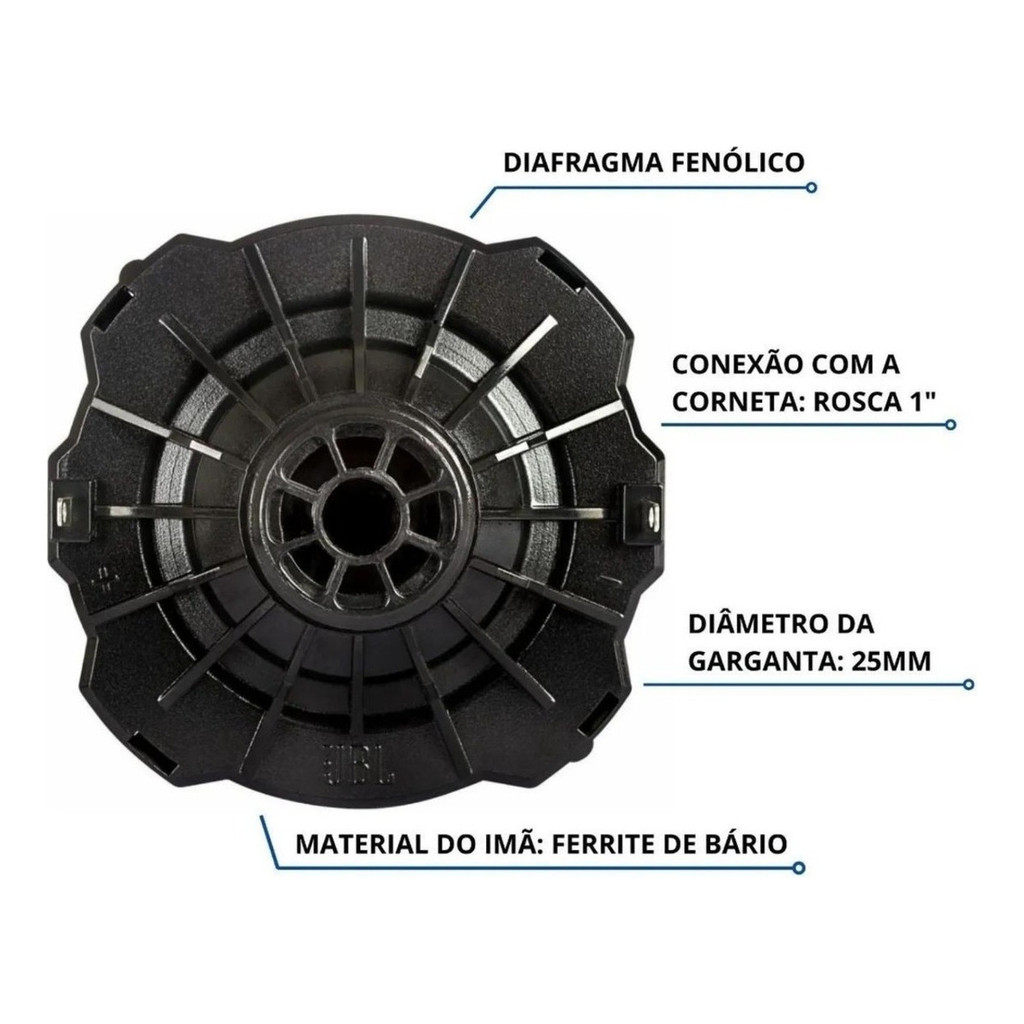 Descrição do Produto O driver JBL D200-X é um componente essencial em seu sistema de áudio, projetado para reproduzir as frequências mais altas com clareza e precisão. Perfeito para trazer vida aos detalhes das músicas e trazer clareza aos tons agudos, este driver é a escolha ideal para os amantes da qualidade sonora. Transforme seu sistema de som com a excelência do JBL D200-X e experimente a música como nunca antes! Especificações Técnicas: • Potência: 110 Watts Rms • Impedância: 8 Ohms • Sensibilidade: 107 dB SPL 1W1m: 3 • Resposta de Frequência -10 dB: 500 - 7500 Hz • Corneta Utilizada nos Testes: HL 14-25 • Frequência de Corte Mínima Recomendada: 500 Hz • Diâmetro da Garganta: 25mm • Material do Diafragma: Fenólico • Material do imã: Ferrite de Bário • Dimensões Aproximadas: 10,7x10,7x6,8 cm (AxLxC) • Peso: 840g O super tweeter ST 200 apresenta elevada eficiência e baixa distorção na reprodução das altas frequências. Pode ser utilizado em sistemas de PA, mini trios automotivos e em sistemas de reforço de som. A base e o difusor são construídos em alumínio contribuindo assim para uma melhor dissipação de calor da bobina móvel, com um acabamento de usinagem diamantada ferramenta de diamante e envernizados. O ângulo de dispersão de sua corneta de 40x40 (HxV) é adequada para atingir longas distâncias. Seu diafragma fenólico reproduz os agudos com um timbre agradável. Especificações Gerais: Dimensões 61 x 115 x 124 mm Impedância nominal 8 Ohms Peso 0,813 kg Peso do ímã 220 Peso do conjunto magnético 650 Potência RMS (NBR 10.303) (c/ xover 5.000 Hz 12 dB / oit) 70 RMS (NBR 10.303) (c/ xover 8.000 Hz 12 dB / oit) 100 RMS Resposta de Frequência do Sistema 2.000 a 20.000 Hz Conteúda da Embalagem 1 Super tweeter ST 200 1 Driver Fenólico D200x Manual Técnico Folheto Garantia
