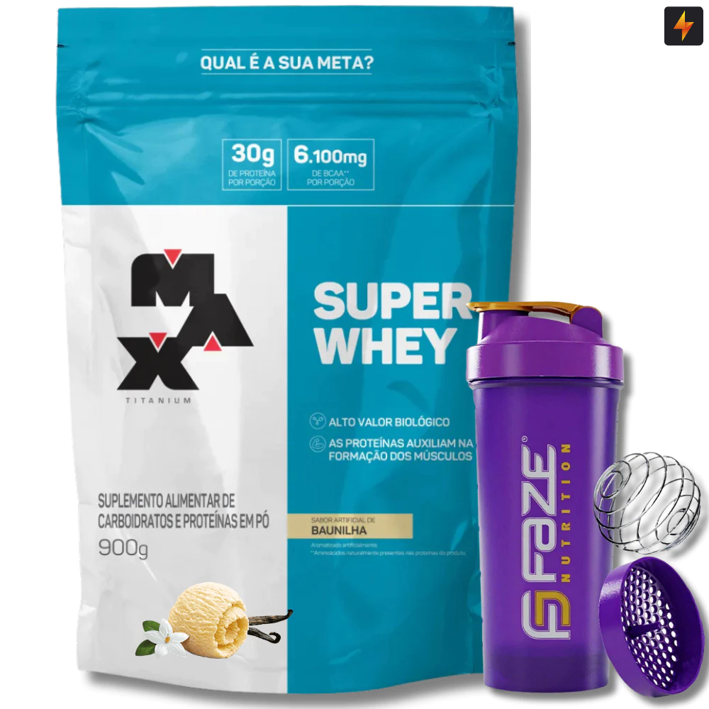 Kit Super Whey Proteína Concentrada 900g Max Titanium + Coqueteleira