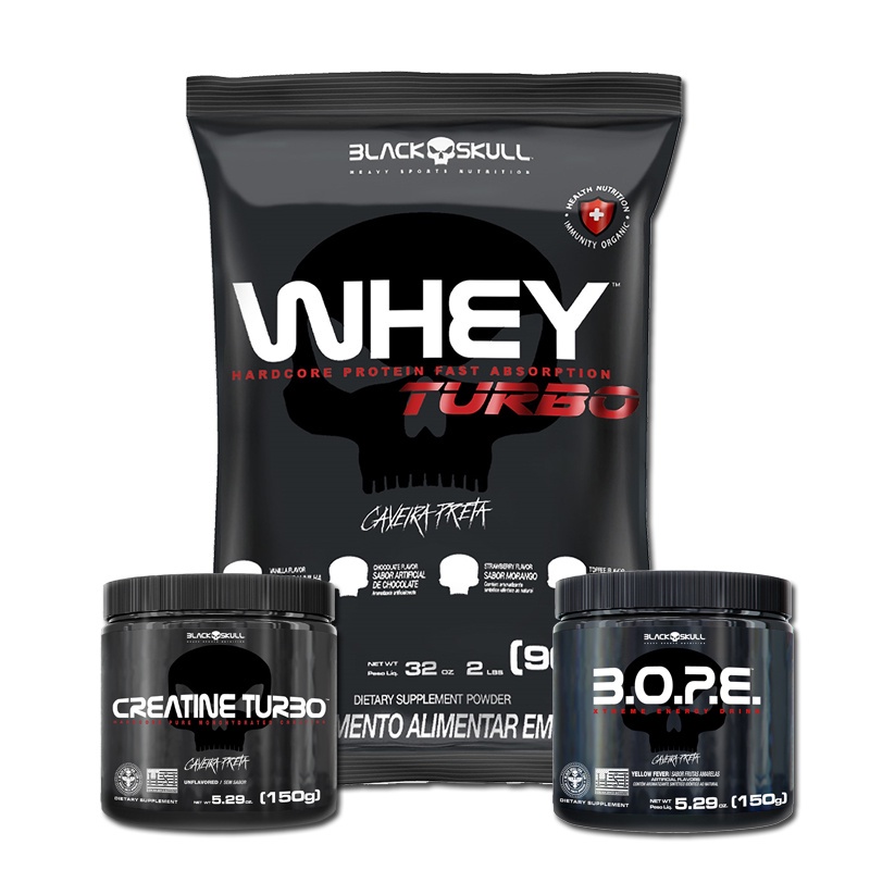 Kit Suplemento Combo Whey Turbo 907g + Creatina 150g + Pre Treino B.O.P.E 150g Bope - Black Skull