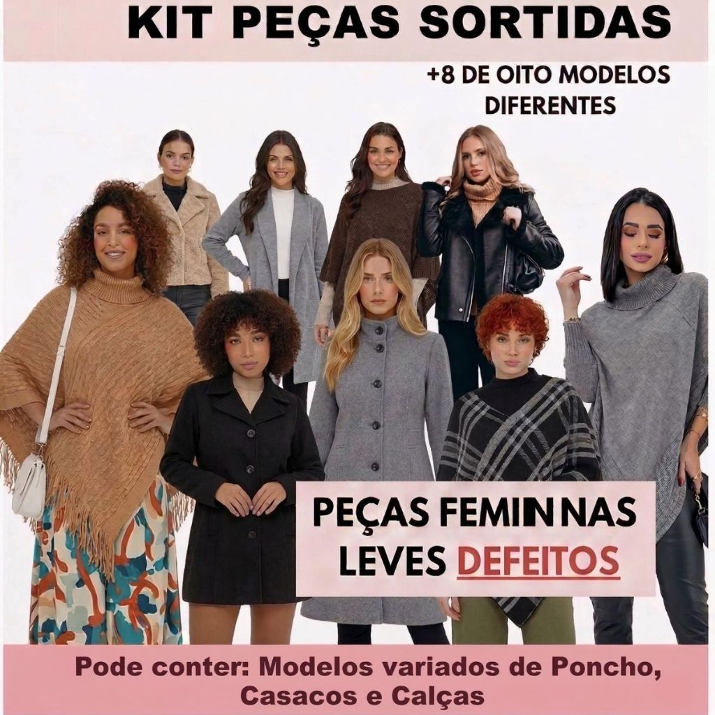 🔥 Kit Feminino 10 Peças Sortidas Com Leves Defeitos – Queima de Estoque 🔥 Kit com 10 peças femininas variadas Leves Defeitos, ideal para quem busca preço baixo, variedade e ótima oportunidade para revenda. 📦 Sobre o kit: Contém 10 peças sortidas Enviado conforme disponibilidade em estoque Pode conter cores e modelos repetidos Peças com leves defeitos, sem comprometer o uso Não é possível escolher modelos ou cores 👚 Pode conter: Tops Regatas Blusas básicas Blusas listradas Blusas de manga longa Bodys Biquíni Croppeds Vestidos Conjuntos Macaquinhos Calças Ponchos Casacos ⚠️ Atenção: Produto promocional de queima de estoque. Quantidade limitada. Aproveite enquanto durar! 💡 Ideal para revenda, bazar ou uso próprio.