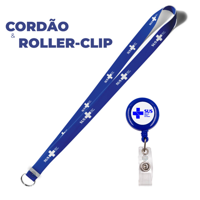 Kit Sus Cordão e Roller Clip Resinado Azul e Branco Porta Crachá