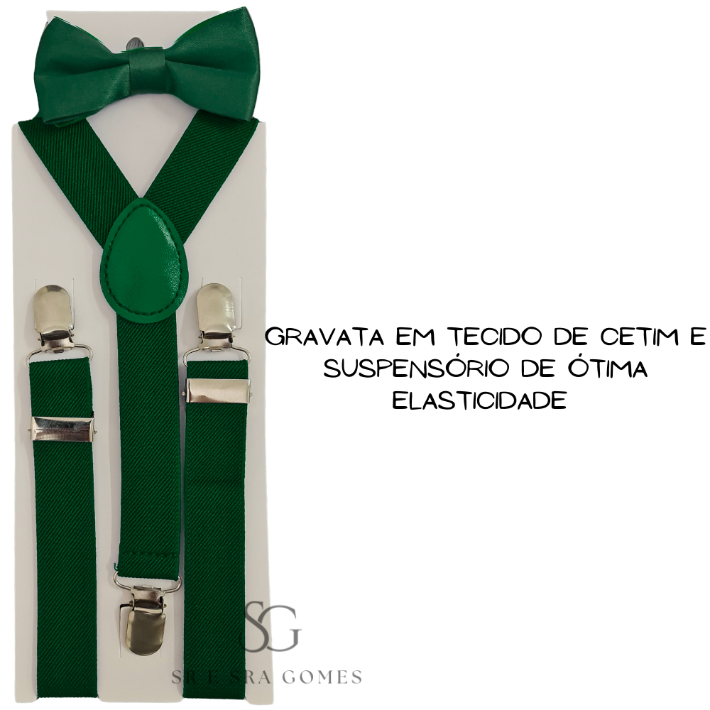 Contém 1 Kit - Suspensório + Gravata Borboleta Verde Musgo Infantil. Aquele item perfeito para deixar o visual diferente e sofisticado, o modelo possui uma grande elasticidade o que garante o conforto na hora de usar, fechos fáceis de abrir e que se fixam bem na hora do encaixe, a gravata também possui regulagem para de adaptar corretamente ao pescoço, todos os materiais de excelente qualidade e durabilidade, para ser usado em diversas ocasiões desde as mais informais até as mais elegantes e sofisticadas, eventos, casamentos, congressos e até mesmo em fantasias. Modelo -TAMANHO ÚNICO. -Infantil. -Veste diversos biótipos por conta da alta elasticidade e da regulagem que possui. Medidas Suspensório -Elásticos laterais 48 cm. -Elástico central 19 cm. -Medida total e uma extremidade a outra 67 cm. Medidas Gravata (possue regulador de tamanho) -Lagura 8,5 cm. -Altura 4.5 cm. Recomendações (sugeridas) Para crianças de 1 ano de idade até 10 anos de até de 1.45 de altura (lembrando que pode-se variar para mais por conta da elasticidade do material) AVISO Pode haver variações de tons dependendo do dispositivo utilizado para a visualização das fotos. Para recompras atente-se ao lote disponível no momento, pode haver variações de tons ou detalhes conforme troca de lote. Para dúvidas entre em contato teremos o prazer de responder!