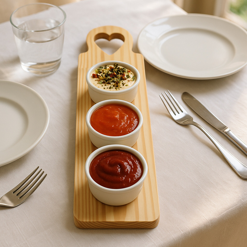 Kit Tábuas Servir Frios Petiscos 3 Ramequins Porcelana Molhos Temperos Bandeja Madeira Pinus Mesa Posta Decoração
