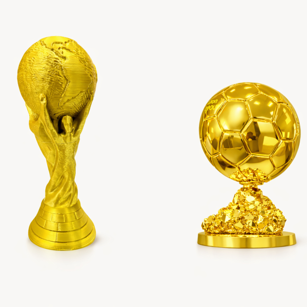 KIT DECORATIVO FUTEBOL CAMPEÃO Transforme sua decoração com um kit que chama atenção de verdade. Com Taça estilo Copa do Mundo 18 cm + Troféu estilo Bola de Ouro 12 cm, este conjunto é ideal para quem quer um ambiente com mais presença, identidade e clima de campeão. Produzido em ABS com acabamento dourado brilhante, é perfeito para aniversários, quartos, escritórios e presentes criativos para fãs de futebol. Garanta já o seu e deixe seu espaço com muito mais destaque. Deixe sua decoração muito mais marcante com um kit inspirado nos troféus mais desejados do futebol. Este conjunto acompanha 1 Taça estilo Copa do Mundo e 1 Troféu estilo Bola de Ouro, perfeito para quem quer montar uma decoração temática com visual de destaque, seja em festa de aniversário, quarto, escritório, estante ou como presente para apaixonados por futebol. O QUE VAI NO KIT 1 Taça estilo Copa do Mundo 1 Troféu estilo Bola de Ouro MEDIDAS Taça: 18 cm Bola de Ouro: 12 cm MATERIAL abs COR Dourado brilhante IDEAL PARA Decoração de aniversário com tema futebol Decoração de quarto Decoração de escritório Estantes e nichos Presente para fãs de futebol Ambientes temáticos esportivos DIFERENCIAIS Kit com 2 peças decorativas Visual dourado chamativo Ótima composição para ambientes temáticos Excelente opção para presentear Tamanho prático para decorar sem ocupar muito espaço Produto com forte apelo visual para fãs de futebol IMPORTANTE Produto de uso decorativo As tonalidades podem apresentar pequena variação conforme iluminação ou tela O anúncio refere-se a 1 taça + 1 troféu bola A chuteira não está inclusa neste anúncio GARANTA O SEU Monte uma decoração com clima de campeão e dê mais destaque ao seu ambiente com este kit temático de futebol.