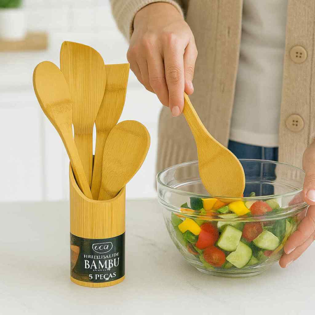 Kit Talheres Bambu Natural | Utensílios de Cozinha Sustentáveis e Duráveis ECO23048