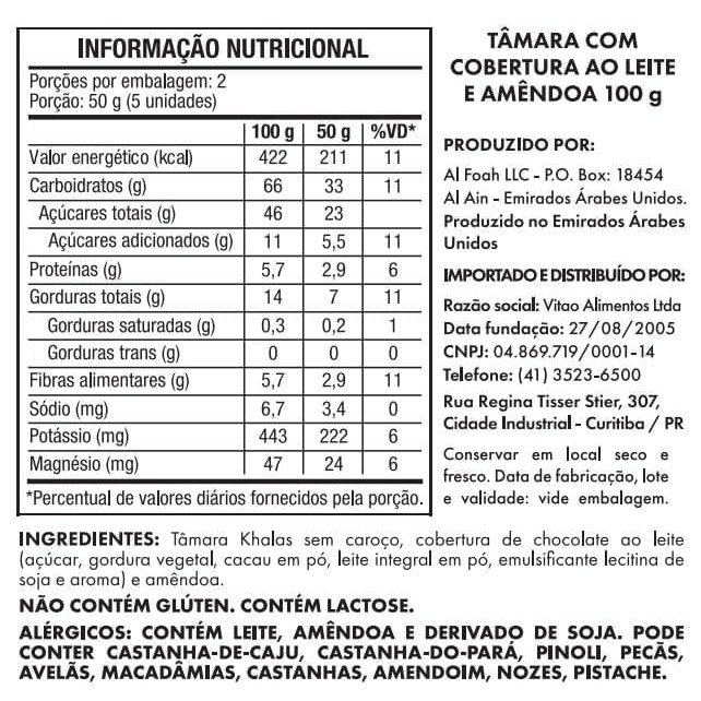 As tâmaras Khalas Date Crown com cobertura de chocolate e recheadas com amêndoas são uma combinação deliciosa e sofisticada. Originárias do Oriente Médio, essas tâmaras premium são conhecidas por sua doçura natural e textura macia. Cada tâmara é cuidadosamente recheada com uma amêndoa crocante e coberta por uma camada de chocolate suave, resultando em uma experiência única de sabor. Além de deliciosas, são ricas em fibras, vitaminas e minerais essenciais, tornando-se uma escolha nutritiva e indulgente para lanches e sobremesas. INGREDIENTES: Tâmara Khalas sem caroço, cobertura de chocolate ao leite (açúcar, gordura vegetal, cacau em pó, leite integral em pó, emulsificante lecitina de soja e aroma) e amêndoa. ALÉRGICOS: CONTÉM LEITE, AMÊNDOA E DERIVADO DE SOJA. PODE CONTER CASTANHA-DE-CAJU, CASTANHA-DO-PARÁ, PINOLI, PECÃS, AVELÃS, MACADÂMIAS, CASTANHAS, AMENDOIM, NOZES, PISTACHE. NÃO CONTÉM GLÚTEN. CONTÉM LACTOSE. SEM GLÚTEN, RICO EM FIBRAS.