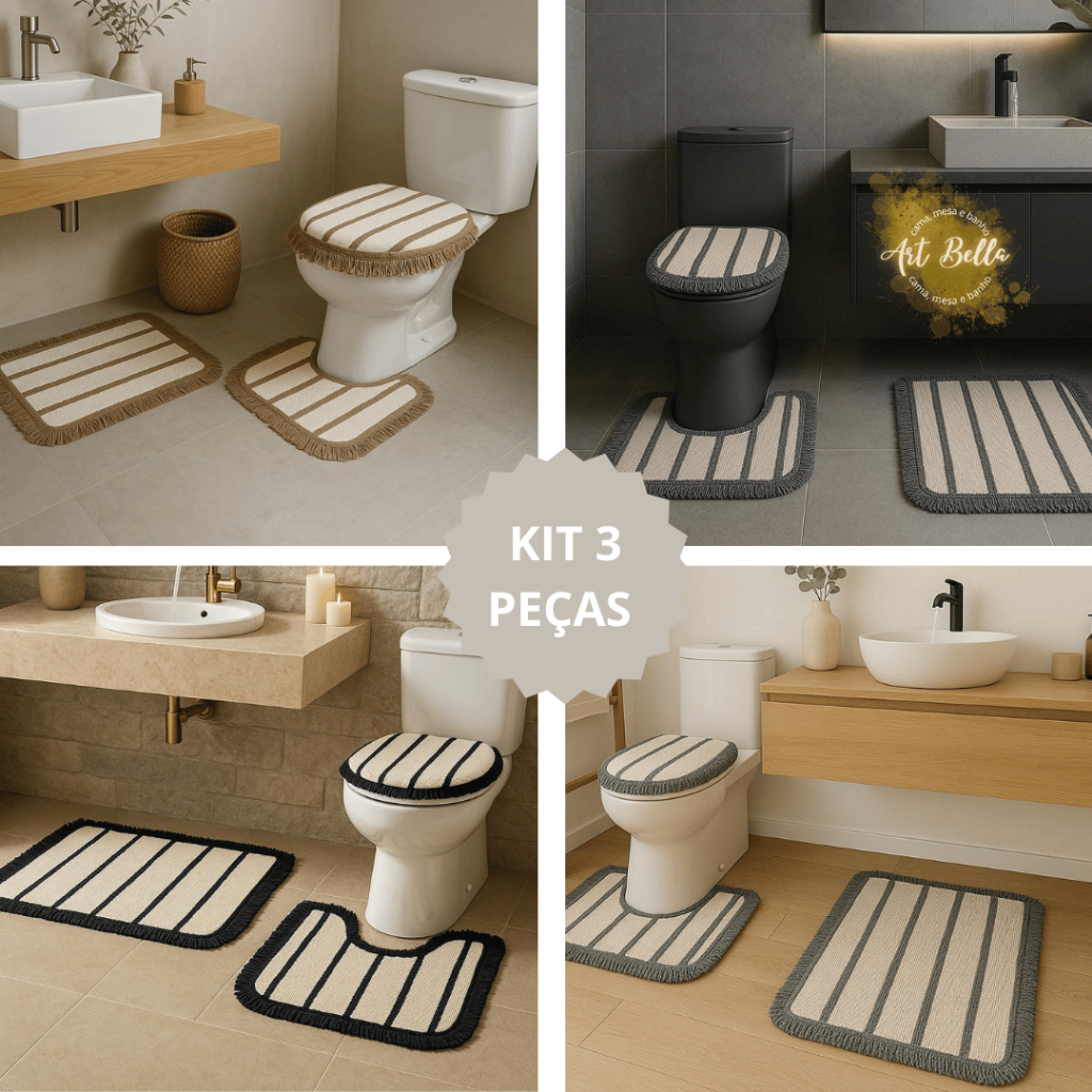 Kit Tapete Banheiro com 3 peças algodão Premium Jogo de Banheiro Decoração listras com franja