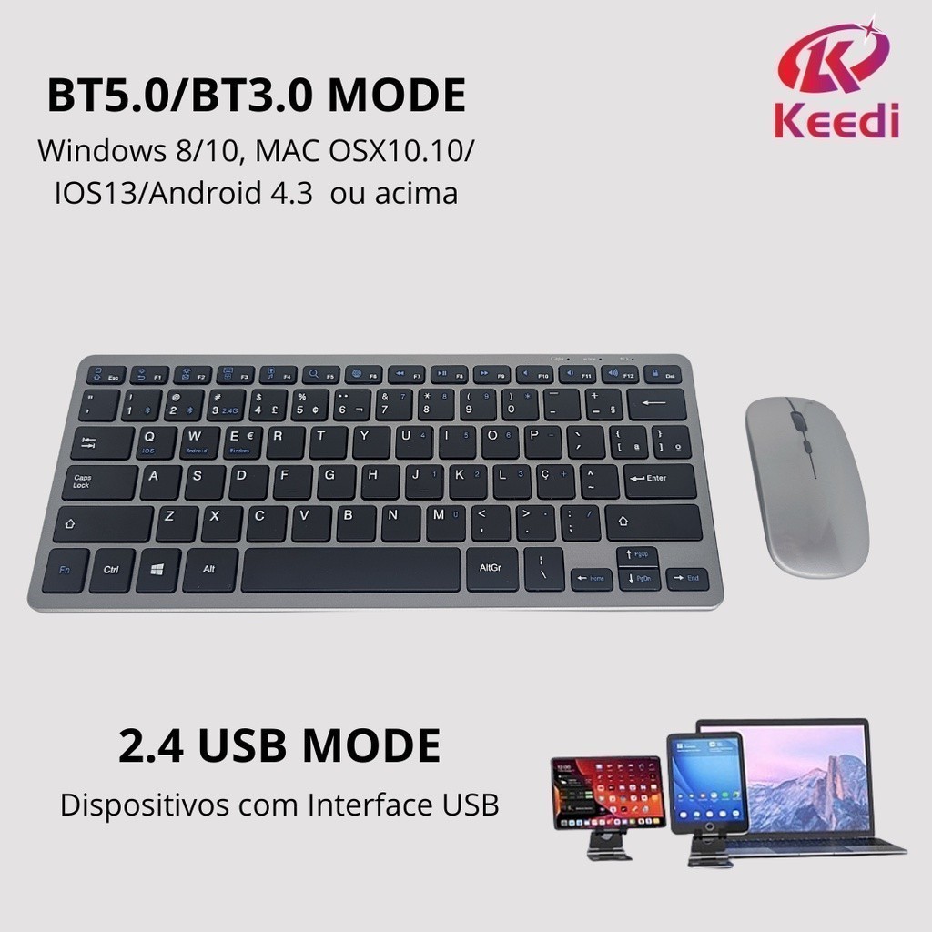 Garanta mais praticidade e conforto no seu dia a dia com o Teclado e Mouse Bluetooth + Wireless. Com design ultrafino e ergonômico, ele é ideal para uso em computadores, notebooks, tablets e celulares, oferecendo uma experiência confortável e eficiente. Seu duplo sistema de conexão permite alternar entre Bluetooth e Wireless com receptor USB, proporcionando maior versatilidade e compatibilidade com diferentes dispositivos. Destaques do Produto: ✔ Conexão dupla: Bluetooth ou Wireless (2.4GHz) ✔ Compatível com PC, notebooks, tablets, celulares e Smart TVs ✔ Teclado no padrão ABNT (Brasil) para melhor digitação ✔ Design ergonômico e ultrafino para maior conforto ✔ Bateria de longa duração Modo Bluetooth: - No teclado pressione FN + C + Tecla 1 para ativar o Bluetooth (a luz vermelha piscará). - No mouse, coloque no modo Bluetooth e ele começar a piscar. - No seu dispositivo, ative o Bluetooth e conecte os aparelhos(Cada um possui um Bluetooth próprio). Modo Wireless (2.4GHz): - Insira o receptor USB no dispositivo. - Aguarde o reconhecimento automático. Compatibilidade com Sistemas Operacionais: - Bluetooth: Pressione FN+C ou FN+C+Tecla 1/2 - Wireless 2.4GHz: Insira o receptor USB e aguarde conexão automática. - Android: Pressione FN+Q - Windows: Pressione FN+W - iOS/Mac: Pressione FN+E Especificações Técnicas: Teclado: - Teclas: 78; - Material: ABS + Metal; - Conectividade: Bluetooth ou Wireless (2.4GHz); - Sistema Operacional: Windows, Android, iOS, Mac; - Teclado Padrão: ABNT (Brasil). Mouse: - Teclas: 3; - Material: ABS + Metal; - Conectividade: Bluetooth ou Wireless (2.4GHz); - Sistema Operacional: Windows, Android, iOS, Mac. Conteúdo: 1x Teclado 1x Mouse 1x Receptor USB Wireless (Armazenado no Mouse) 1x Cabo USB-C 1x Manual teclado 1x Manual Mouse