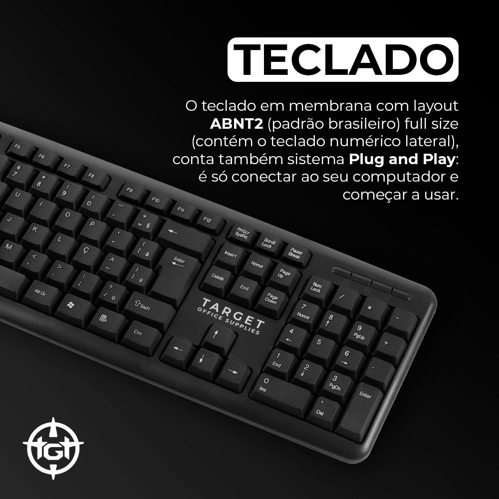 KIT TECLADO E MOUSE OFFICE TGT GR100 V3, ABNT2, 1000DPI, PRETO, TGT-GR100-BK03 KIT TECLADO E MOUSE TGT GR100 V3 Inicie sua jornada de trabalho ou estudos utilizando o kit de periféricos TGT GR100 V3: Ele contém os principais itens para tornar o seu dia a dia mais prático e dinâmico. Este kit de periféricos se propõe a entregar os atributos necessários para fazer a diferença nos momentos mais atarefados do seu dia! TECLADO O teclado em membrana tem um toque suave e silencioso, ideal para seu cotidiano. O seu layout é o ABNT2 (padrão brasileiro) full size (contém o teclado numérico lateral), garantindo assim toda a confiança e precisão que você precisa. Eles contam sistema Plug and Play: é só conectar ao seu computador e começar a usar! MOUSE O mouse possui 3 botões de ótima precisão que irão atuar de forma confiável durante suas jornadas de trabalho ou estudo. Ele garante o conforto, a ergonomia e a praticidade desejadas para as mais variadas atividades que você executar. VISUAL Contribuindo para um visual limpo e discreto, o GR100 V3 é completamente preto, tendo apenas a impressão da logomarca na cor branco no centro da estrutura do mouse e na impressão das teclas do teclado, facilitando assim que ele se mescle com ambientes diversos, seja em um escritório ou em sua residência. Informações Adicionais: Marca: TGT Modelo: TGT-GR100-BK03 Teclado: Tipo: Com fio Material: Plástico ABS Padrão: ABNT2 Porta de conexão: USB Cor: Preto A prova d’água e resistência ao calor Comprimento do cabo do teclado: 125 cm Dimensões: 44 x 14 x 2 cm Mouse: Material: Plástico ABS DPI: 1000 DPI Cor: Preto Porta de conexão: USB Vida útil: 10 milhões de cliques Botão: 3D Comprimento do cabo do mouse: 110 cm Dimensões: 65 x 112 x 35 mm *Garantia do vendedor: 12 meses. _______________________________ PICHAU INFORMÁTICA LOJA OFICIAL A Pichau Informática, com mais de 17 anos de experiência, é um dos principais nomes no mercado nacional de tecnologia. Comprometida com a qualidade, eficiência e satisfação do cliente, busca constantemente melhorias para oferecer serviços e produtos de excelência.