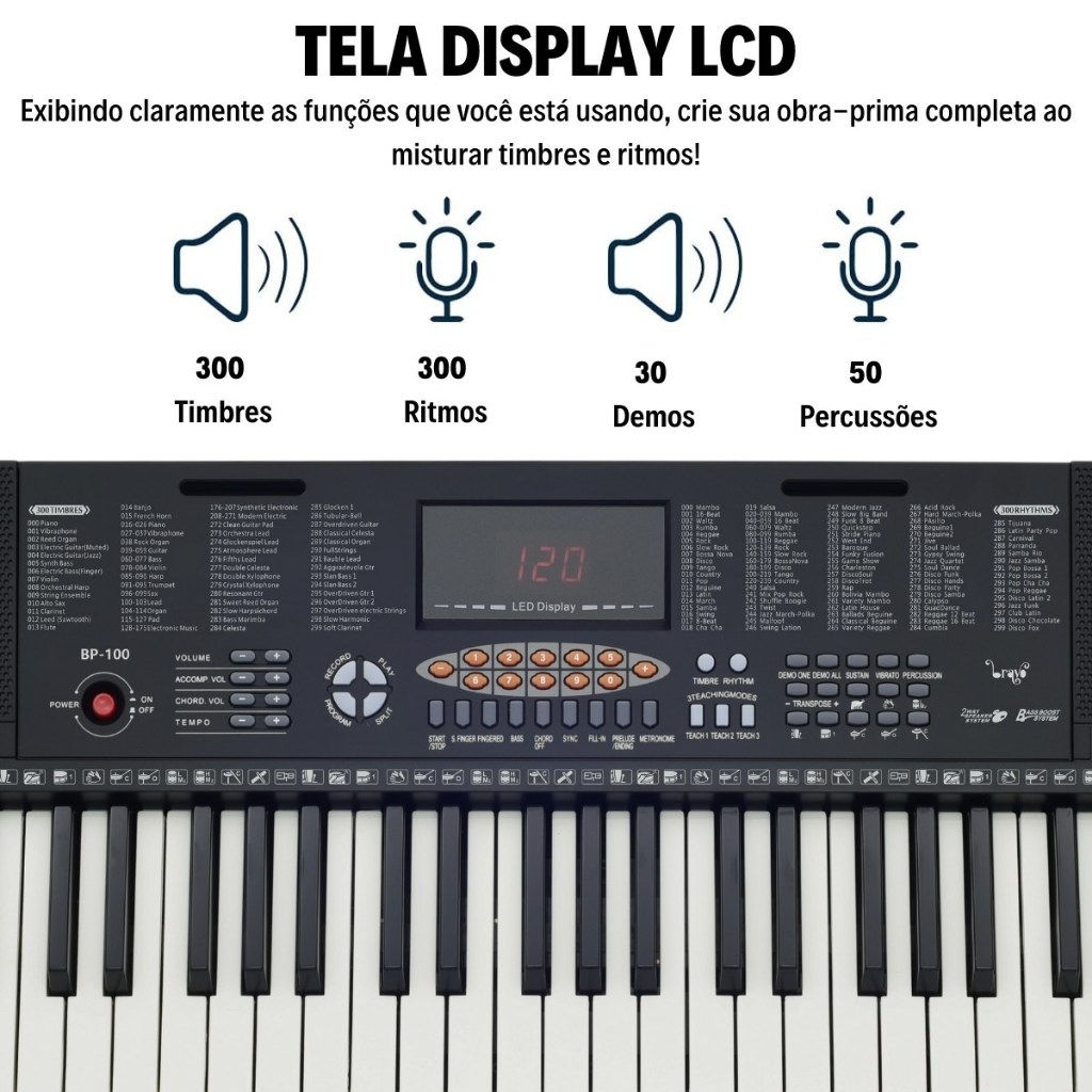 Itens inclusos: 1x Teclado Musical 5/8 Bravo Bp100 1x Suporte em X para teclado 1x Capa Teclado com bolso 1x Fonte para teclado 1x Suporte partituras de teclado Introduzindo o Teclado Musical Bravo BP-100, o novo padrão em termos de teclados musicais que oferecem um incrível custo-benefício. Projetado meticulosamente para estudantes e entusiastas musicais, este teclado compacto de 5/8 é uma escolha inigualável para aprimorar suas habilidades musicais. Com uma impressionante variedade de recursos, o Bravo BP-100 coloca o poder da música ao seu alcance. Com 300 timbres e 300 ritmos, você terá uma ampla gama de sons para explorar e se inspirar. Além disso, com 67 percussões de teclado e 30 demos, a diversidade musical está sempre à sua disposição. Não apenas um teclado, mas também um professor, o BP-100 oferece três modos de ensino para ajudá-lo a aprimorar suas habilidades musicais de maneira eficaz. Além disso, suas características avançadas, como transpose, sustentação, vibrato, modo de gravação e demonstração, tornam o Bravo BP-100 um parceiro musical versátil e poderoso. Com saída para fones de ouvido ou caixas de som, entrada para microfone externo e entrada de áudio P2, este teclado se adapta facilmente às suas necessidades de conexão. E, com a opção de alimentação via fonte externa ou pilhas AA, você pode levar sua música onde quer que vá. Especificações: 300 Timbres 300 Ritmos 67 Percussões De Teclado 30 Demos 3 Modos De Ensino Controle De Volume Principal Controle De Volume De Acompanhamento Transposição Tempo Funções: Sustain / Vibrato / Metro / Split / Record / Program / Demo One / Demo All Saída Para Fones De Ouvido ou Caixa de Som Entrada Para Microfone Externo Entrada De Áudio P2 Alimentação: Fonte externa (incluso) ou 6 Pilhas AA (não incluso) Dimensões do teclado: 84x28x9cm Largura da tecla: 2 cm Produto 100% original com garantia em todo Brasil.