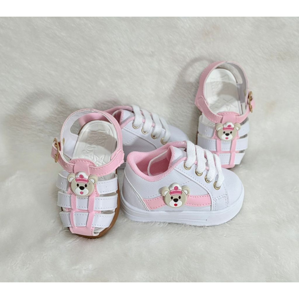 Kit tênis e sandália bebê em branco e rosa enfeite ursa marinheira primeiros passos confortável