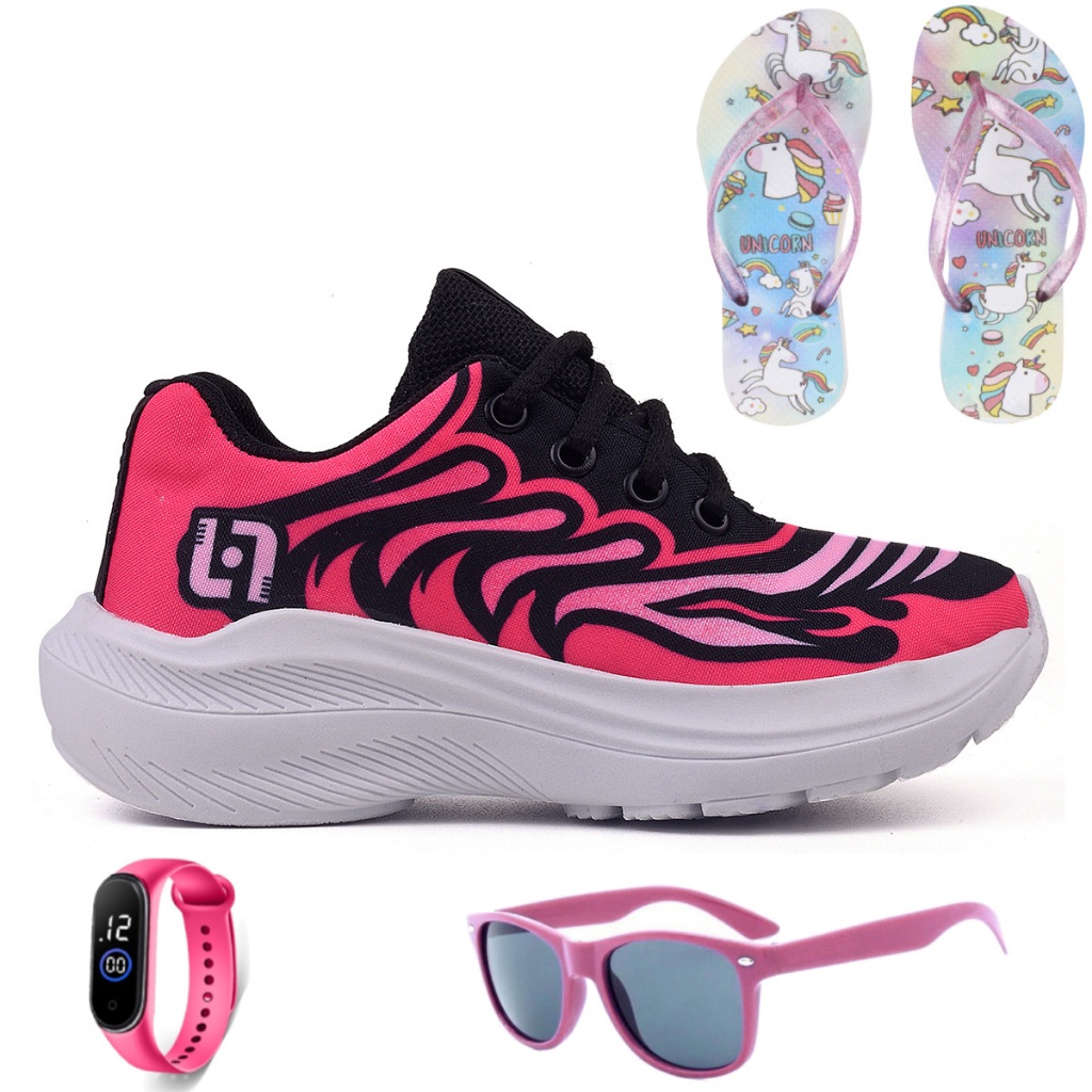 Kit Tênis Infantil Casual Meninas Escolar Basico Confortavel + Chinelo Oculos e Relogio