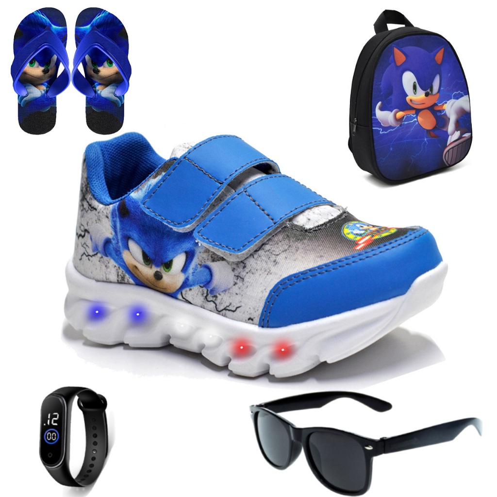 kit Tênis Masculino Infantil De Led Meninos Sonic Velcro Preto Royal + Mochila + Chinelo + Óculos e Relógio Linkito