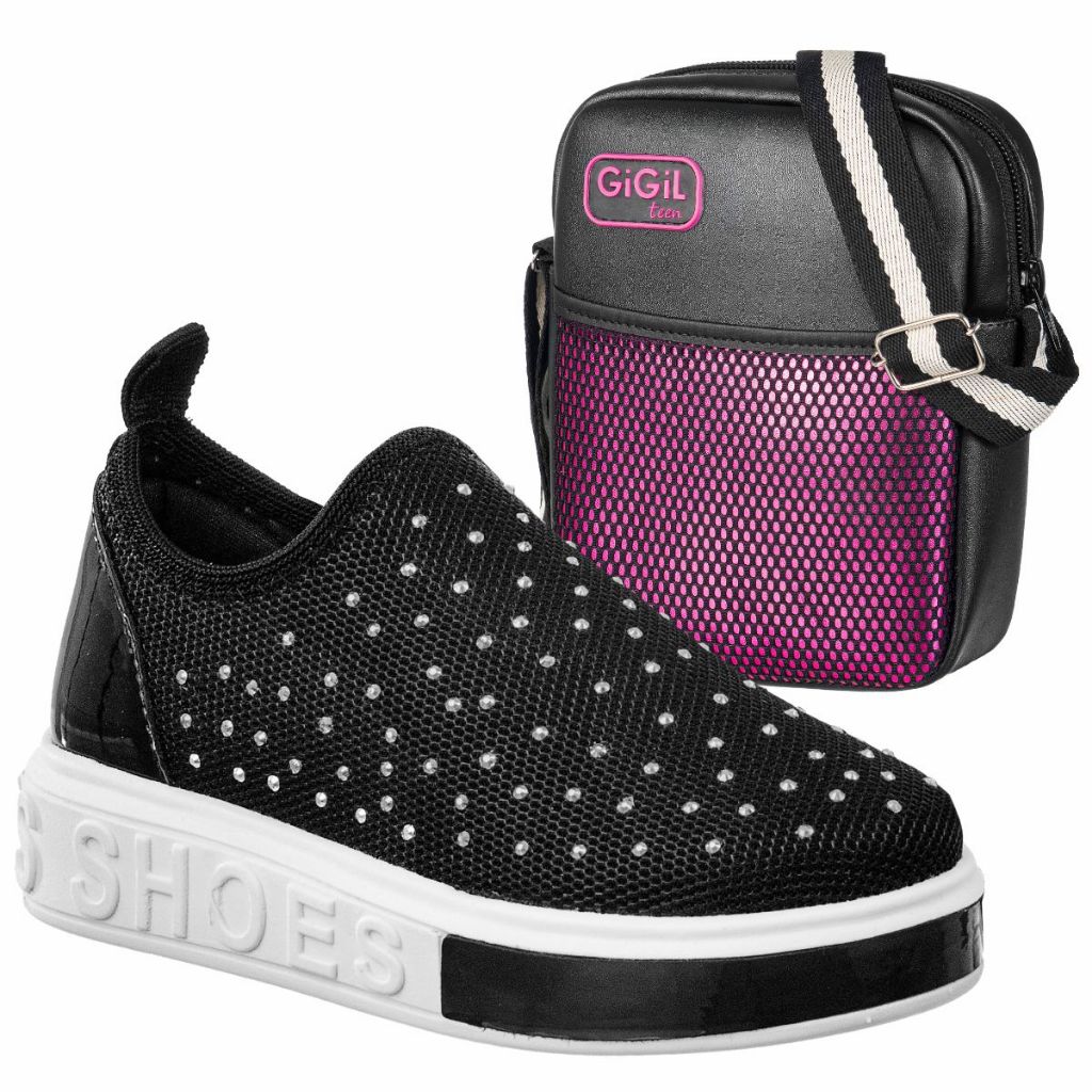 Kit Tenis Meia Infantil GiGiL Teen Feminino Slip-on Calce Fácil Com Bag Ombro Transversal Confortável Menina Promoção