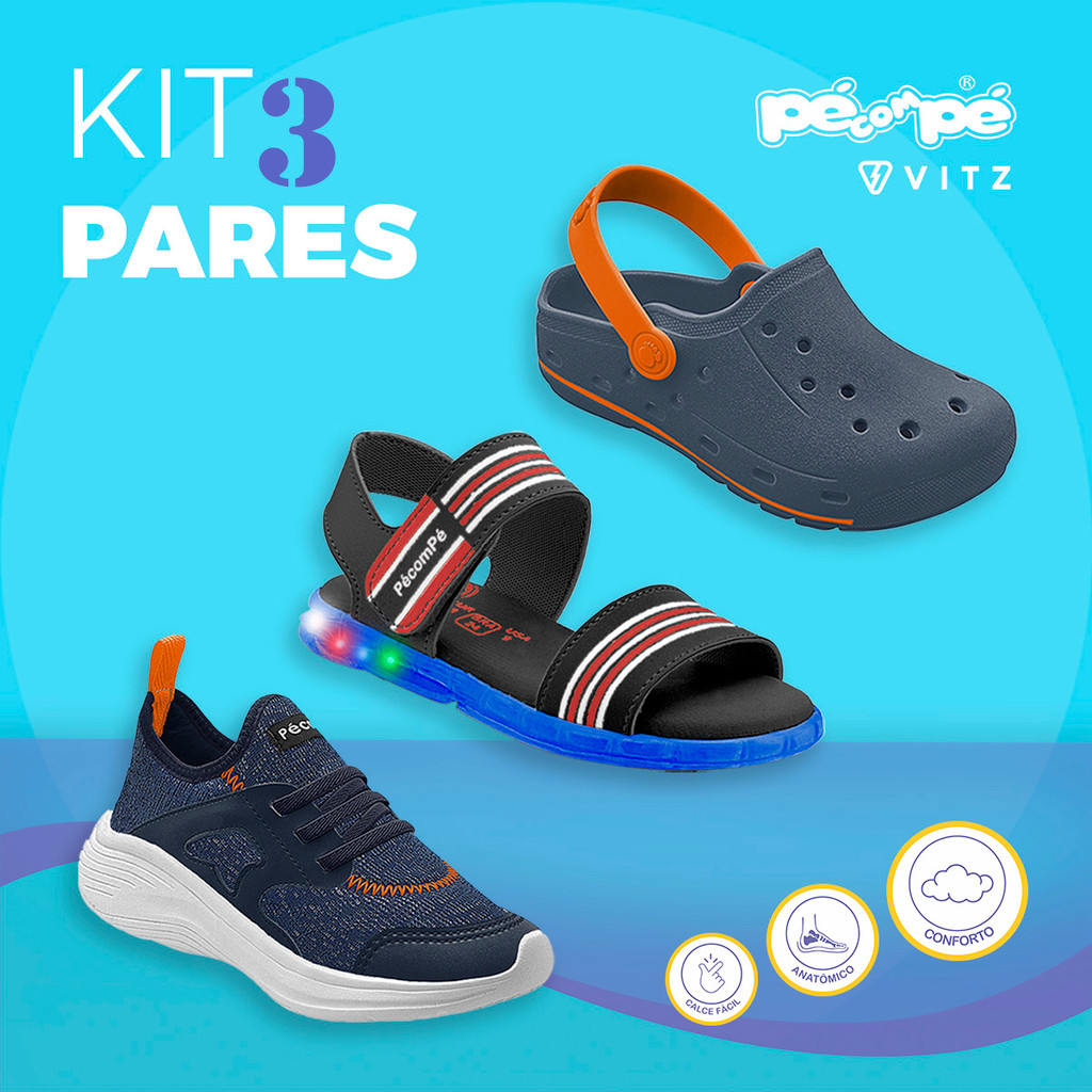 Esse kit exclusivo reúne três opções de calçados infantis que unem estilo, conforto e praticidade para acompanhar todas as aventuras das crianças. A sandália vem com solado que acende luzes coloridas a cada passo, trazendo diversão e segurança com tiras ajustáveis e design moderno. Já o tênis oferece um visual esportivo com cabedal respirável, elástico que facilita o calce e solado leve que garante liberdade nos movimentos. Completando o trio, o babuche é versátil e prático, perfeito para momentos de lazer e brincadeiras, trazendo ventilação estratégica e tiras traseiras que oferecem mais firmeza. Juntos, esses três modelos formam um kit que atende diferentes momentos do dia a dia, unindo conforto, praticidade e estilo para os pequenos explorarem o mundo com alegria. *** ATENÇÃO *** Gentilmente solicitamos, sempre antes da compra, conferir as medidas na tabela abaixo conforme o comprimento do pé da criança. COMO MEDIR: Desenhe o pé da criança em uma folha, risque na posição do começo do calcanhar, e na frente do dedão e utilize a medida entre os dois. TABELA DE MEDIDAS: TÊNIS--Medida(cm) Nº 23--14.8 cm Nº 24--15.5 cm Nº 25--16.2 cm Nº 26--16.8 cm Nº 27--17.5 cm Nº 28--18.2 cm PAPETE--Medida(cm) Nº 23--15.3 cm Nº 24--16.0 cm Nº 25--16.7 cm Nº 26--17.3 cm Nº 27--18.0 cm Nº 28--18.7 cm BABUCHE--Medida(cm) Nº 23/24--16.0 cm Nº 25/26--17.3 cm Nº 27/28--18.7 cm *** PÉ COM PÉ - CONCEITOS DE MENINOS E MENINAS *** A Pé com Pé é uma Marca especializada em calçados infantis masculinos e Femininos. A marca projeta através de suas coleções uma criança moderna, atual e com personalidade. Tudo seguindo as tendências internacionais de moda e com combinações de cores incríveis! Nossos produtos têm design exclusivo e perfeito ajuste aos pés das crianças, garantindo conforto e bem estar. A combinação de looks com os calçados Pé com Pé garantem muito mais charme e elegância para quem já é um príncipe ou princesa para a família. Qualidade comprovada em cada detalhe! Nossa marca está passo a passo com os sonhos das crianças! Qualquer dúvida entre em contato conosco. Estamos à disposição!
