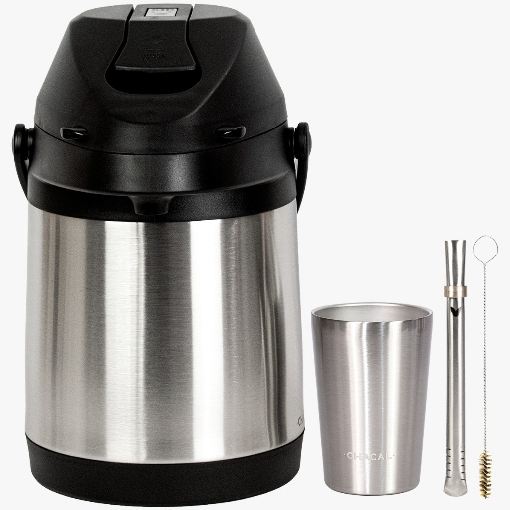***MANDAR O NOME PARA PERSONALIZAR NO CHAT APÓS A COMPRA. CASO SEJA LOGO MANDAR NO CHAT PARA APROVAÇÃO ANTES DA COMPRA*** Acompanha (Kit Preto Copo 200ml): KIT COMPLETO CHACAL (GARRAFA-COPO-BOMBA) 1- Copo Tereré Térmico Chacal Preto 200ml 1- Bomba Tereré Chacal PRETA 1- Garrafa Térmica Chacal Inox 2,5 Litros PRETA Acompanha: Limpador de Bomba* Acompanha (Kit Inox Copo 360ml): KIT COMPLETO CHACAL (GARRAFA-COPO-BOMBA) 1- Copo Tereré Térmico Chacal Inox 360ml 1- Bomba Tereré Chacal INOX 1- Garrafa Térmica Chacal Inox 2,5 Litros INOX Acompanha: Limpador de Bomba* Acompanha (Kit Preto Copo 236ml): 1- Copo Tereré Térmico Chacal Preto 236ml 1- Bomba Tereré Chacal PRETA 1- Garrafa Térmica Chacal Inox 2,5 Litros PRETA Acompanha: Limpador de Bomba* Acompanha (Kit Inox Copo 236ml): 1- Copo Tereré Térmico Chacal Branco 236ml 1- Bomba Tereré Chacal PRETA 1- Garrafa Térmica Chacal Inox 2,5 Litros INOX Acompanha: Limpador de Bomba* Características do Produtos: Capacidade da garrafa para 2.5 Litros. Adequado para líquidos frios e quentes. Mantem a temperatura por mais tempo. Bombeamento por alavanca. Base giratória 360°. Alça móvel para transporte. Parede dupla em aço inoxidável. Tampa removível e boca larga para facilitar a limpeza. Bloqueio de segurança para crianças. Garantia: 90 dias do Fabricante.