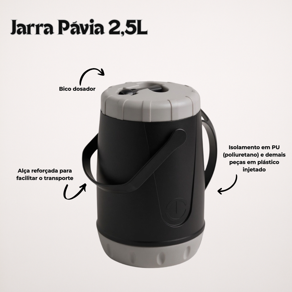 🧉❄️ Kit Tererê – Jarra Pavia 2,5L + Copo Térmico 650mL Tudo o que você precisa para curtir um tererê geladinho onde quiser! 🧊 Conserva a bebida gelada por mais tempo – isolamento térmico eficiente em PU (poliuretano). 🥤 Jarra Pavia 2,5L – ideal para preparar e servir o tererê para a galera. 🥛 Copo térmico 650mL – mantém a bebida na temperatura ideal. 🏖️ Perfeito para praia, piscina e passeios – leve, prático e fácil de transportar. ✨ Design moderno e funcional – pensado para o uso diário e momentos de lazer. 📦 Itens Inclusos: Jarra Pavia 2,5L Copo Térmico Tererê 650mL 📏 Especificações Técnicas: 🥤 Capacidade total: 3,1L ⚖️ Peso: 0,72kg 🧪 Material: isolamento em PU (poliuretano) + plástico injetado (PP) 🎯 Ideal para: 🏖️ Praia e piscina 🌳 Passeios ao ar livre 🧉 Tererê e bebidas geladas 🎁 Presente prático e diferenciado