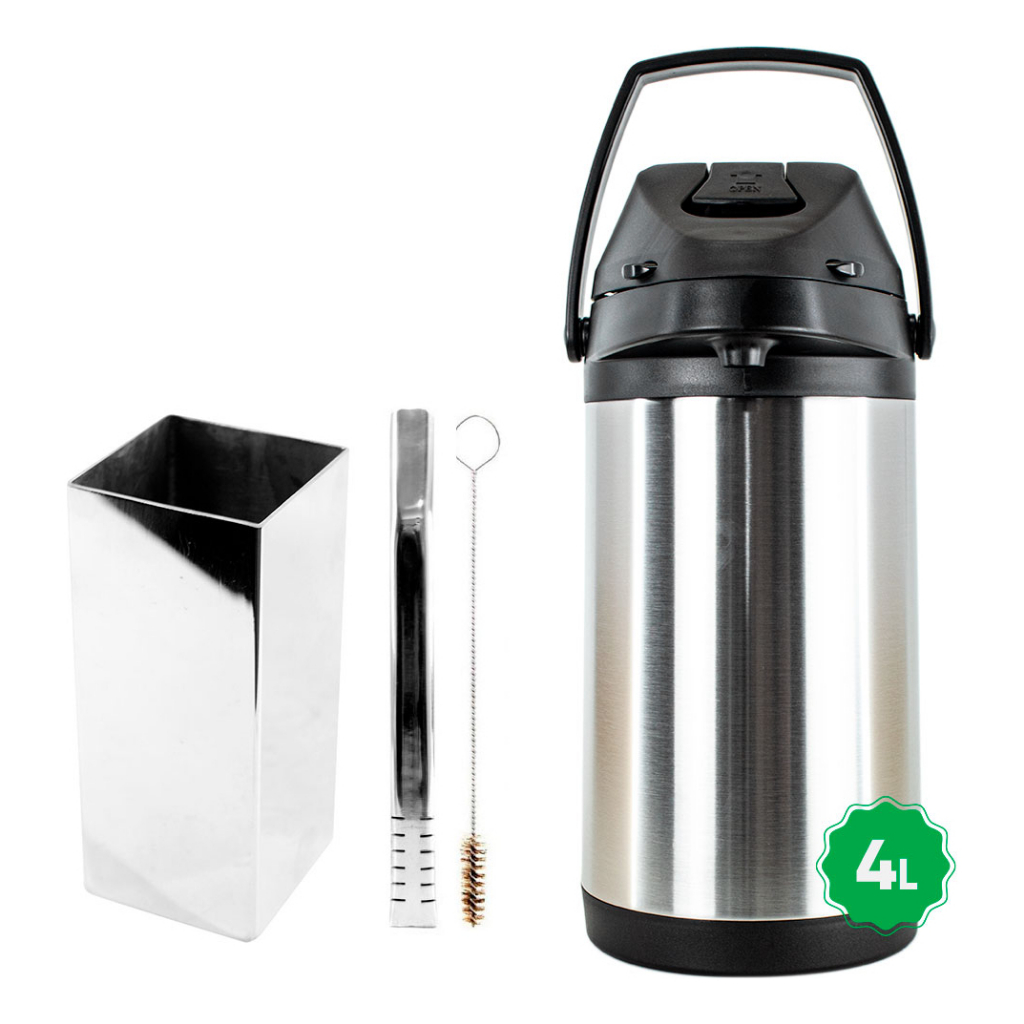 Acompanha: 1 - Copo Tereré Inox (Escolha Modelo) 1 - Bomba Tereré Inox (Escolha Modelo) 1 - Garrafa Térmica Tereré Inox 4 Litros (Escolha Modelo) *Limpador de Bomba* Características do Produtos: - Capacidade para 4 Litros. - Adequado para líquidos frios e quentes. - Mantem a temperatura por mais tempo. - Bombeamento por alavanca. - Base giratória 360°. - Alça móvel para transporte. - Parede dupla em aço inoxidável. - Tampa removível e boca larga para facilitar a limpeza. - Bloqueio de segurança para crianças.