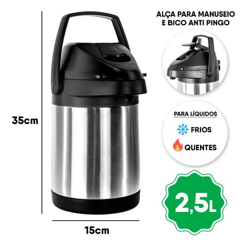 ****CASO QUEIRA OUTRO MODELO DE LOGO, ENTRAR NO CHAT PARA VERIFICAR POSSIBILIDADE.**** Acompanha: 1 - Copo Tereré Inox QUADRADO PRETO 1 - Bomba Tereré Inox FILETE PRETA 1 - Garrafa Térmica Tereré Inox 2,5 LITROS PRETA *Leva: Limpador de Bomba* Personalização: 1 Gravação Copo: (ESCOLHA MODELO) 1 Gravação Bomba: (ESCOLHA MODELO) 1 Gravação Garrafa: (ESCOLHA MODELO) - Capacidade para 2.5 Litros. - Adequado para líquidos frios e quentes. - Mantem a temperatura por mais tempo. - Bombeamento por alavanca. - Base giratória 360°. - Alça móvel para transporte. - Parede dupla em aço inoxidável. - Tampa removível e boca larga para facilitar a limpeza. - Bloqueio de segurança para crianças.