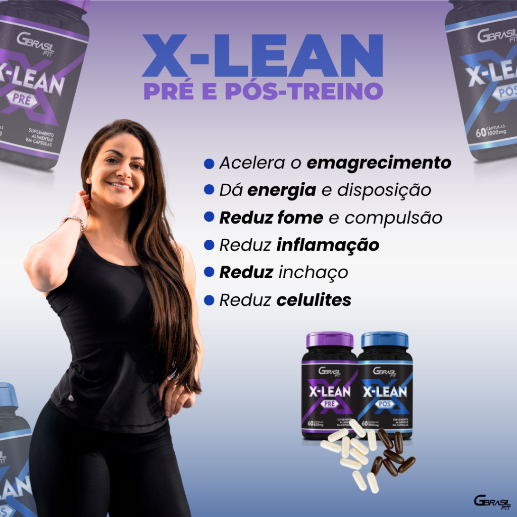 ATENÇÃO: ESTE PRODUTO ESTÁ PRÓXIMO AO VENCIMENTO. DEVE SER CONSUMIDO ATÉ 31/05/2026!!! COMPOSIÇÃO DO ANÚNCIO 1 x Pote de Pré-Treino 500mg (60 cápsulas) 1 x Pote de Pós- Treino 1000mg (60 cápsulas) DESCRIÇÃO DO ANÚNCIO Após anos de estudos, pesquisas e experiências pessoais, Giovana Guido (fundadora da G Brasil Fit, formada em Nutrição há 17 anos, Certificada em Nutrição nos EUA, pós-graduada em Nutrição Clínica, pós-graduada em Nutrição Esportiva e ex-atleta fitness) elaborou uma fórmula termogênica exclusiva, diferenciada e eficaz para agilizar seus resultados na queima de gordura e definição muscular. X-LEAN é o primeiro termogênico do mercado com formulação diferenciada para uso no PRÉ e PÓS-TREINO, podendo ser usado antes e após qualquer modalidade que você pratique (musculação, atividades aeróbicas, artes marciais, ciclismo, natação, Crossfit, etc.). PRÉ-TREINO X-LEAN CONTÉM ESTIMULANTES COMPOSIÇÃO: - X-LEAN PRÉ: 700mg de L-Arginina, 200mg de Cafeína, 84mg de guaraná em pó, 35mg de Niacina e 138mcg de Picolinato de cromo. __________________________________________________________________________________________________________________________ PÓS-TREINO X-LEAN LIVRE DE ESTIMULANTES COMPOSIÇÃO: - X-LEAN PÓS: 250mg Óleo de chia, 250mg Óleo de linhaça, 1,5mg de Proantocianidinas de Cranberry e 200mg Coenzima Q10. MODO DE USAR: Tome de 1-2 cápsulas do X-LEAN PRÉ pela manhã ou antes do treino e 2 cápsulas de X-LEAN PÓS logo ao terminar a atividade física. Em dias sem treino, use o X-LEAN PRÉ ao acordar e o X-LEAN PÓS no período da tarde com água de 20-30 minutos antes de alguma refeição. ADVERTÊNCIAS: Esse produto não é recomendado para hipertensos, cardíacos, crianças, adolescentes, gestantes, lactantes e usuários de anticoagulantes. Não é recomendado o consumo com bebida alcoólica. Consulte seu médico e/ou nutricionista antes de usar qualquer tipo de suplemento. NÃO CONTÉM GLÚTEN. NÃO CONTÉM LACTOSE.