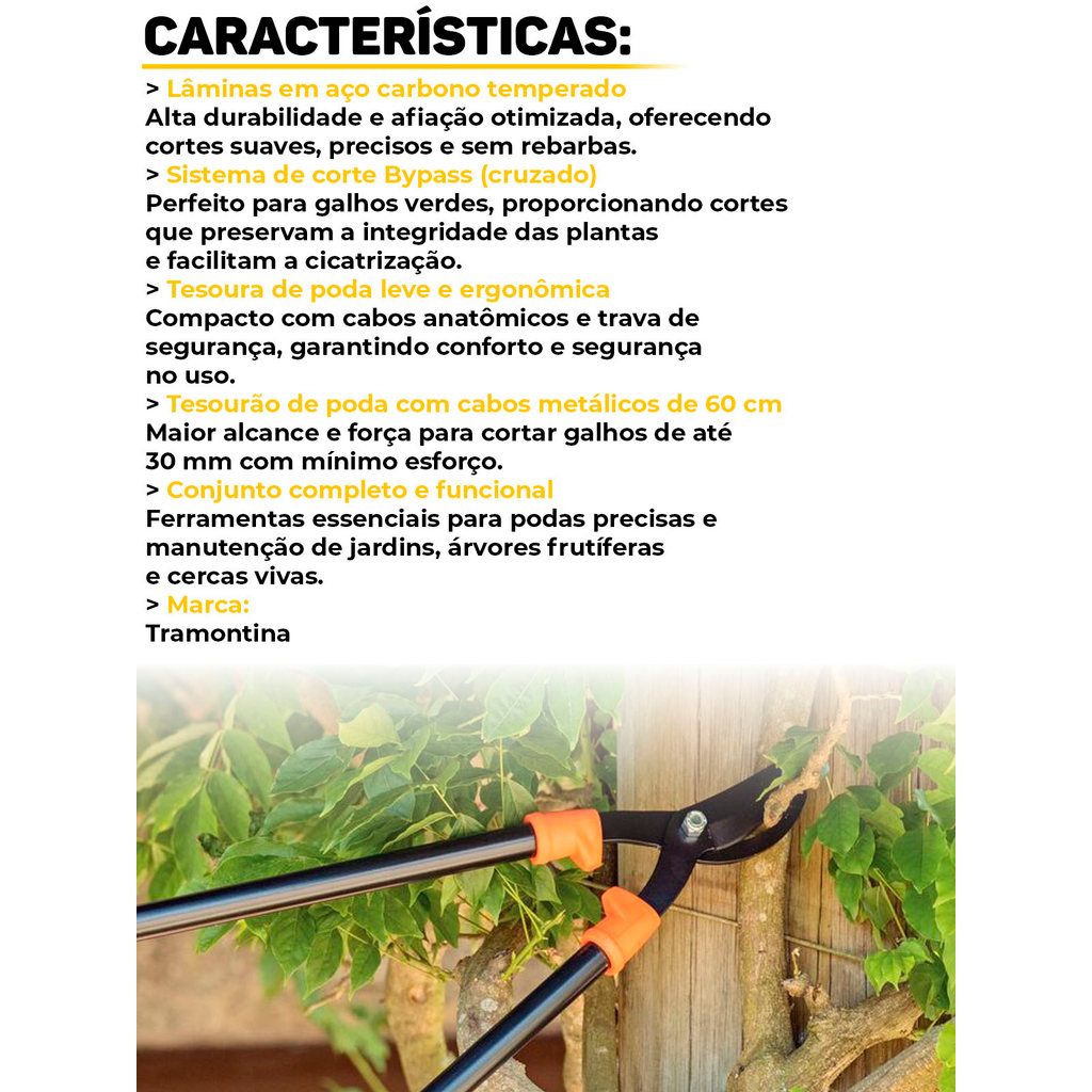 Conjunto De Tesoura De Poda E Tesourão De Poda Cabo Metálico Tramontina Mantenha seu jardim sempre saudável e bem cuidado com o Conjunto Tesoura e Tesourão de Poda Tramontina 2 Peças. Desenvolvido para oferecer eficiência, precisão e durabilidade, este kit é indispensável tanto para jardineiros amadores quanto profissionais que buscam resultados de alto padrão em poda e manutenção de áreas verdes. Composto por uma tesoura de poda ergonômica e um tesourão com cabo metálico resistente, o conjunto garante cortes limpos, precisos e seguros em galhos e plantas. Suas lâminas em aço carbono temperado proporcionam maior durabilidade do fio e desempenho superior, facilitando o trabalho e reduzindo o esforço físico. O sistema de corte Bypass (corte cruzado) realiza cortes delicados e sem rebarbas, preservando a saúde das plantas e acelerando sua cicatrização. Com design pensado no conforto do usuário, os cabos anatômicos oferecem pegada firme e ergonômica, enquanto o batente plástico evita impactos entre as mãos, tornando o uso muito mais confortável e seguro. Características: > Kit completo com tesoura e tesourão de poda Tramontina; > Lâminas afiadas em aço carbono temperado para cortes precisos; > Sistema Bypass, ideal para galhos verdes e cortes sem rebarbas; > Design ergonômico que reduz o esforço e aumenta o conforto; > Perfeito para manutenção de jardins, hortas e áreas verdes. Especificações: - Tesoura de Poda; > Leve e fácil de manusear; > Lâminas em aço carbono temperado com excelente durabilidade; > Ajuste de aproximação entre as lâminas; > Estrutura maciça em alumínio injetado; > Cabos ergonômicos e trava de segurança; > Diâmetro máximo de corte: 17 mm. - Tesourão de Poda; > Cabos metálicos de 60 cm com empunhaduras ergonômicas; > Batente plástico que evita impactos entre as mãos; > Ideal para galhos com diâmetro de até 30 mm. - Marca: Tramontina - Garantia: 12 meses contra defeitos de fabricação Vantagens de comprar na Brester: - Produto a pronta entrega. - Produto novo, com garantia de fábrica. - Nota fiscal para Pessoa Física e Pessoa Jurídica.