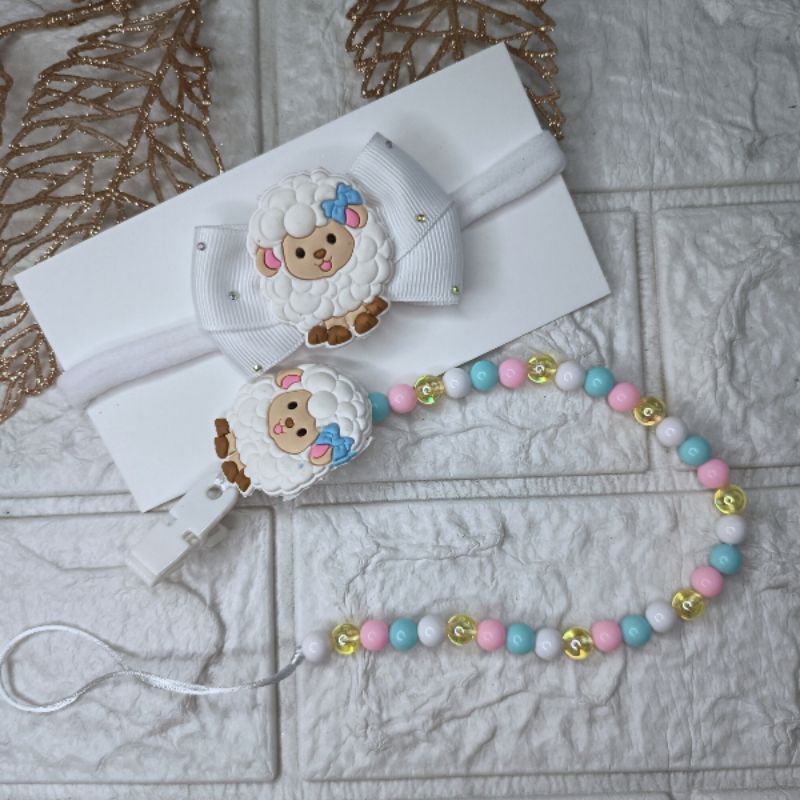 Kit Tiara Laço Cruzado + Prendedor Ovelhinha, raposa e Minie Personalizado – Meia de Seda Confortável