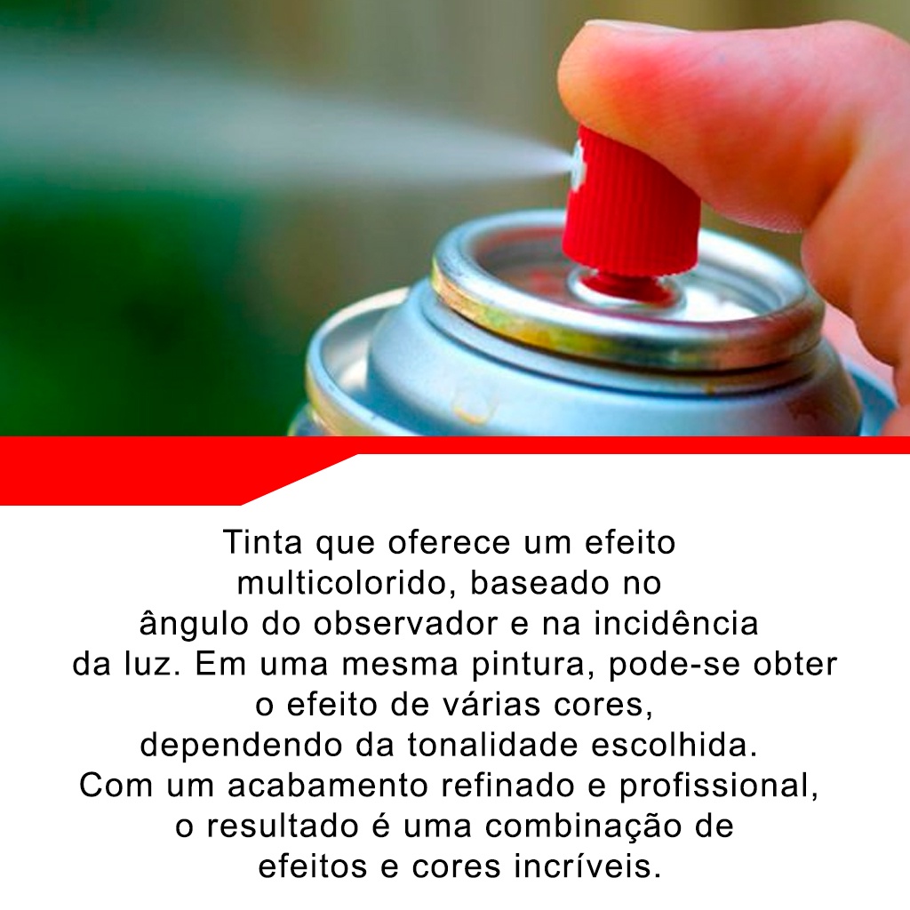 COMERCIAL VIPASA DISTRIBUIDORA.Kit Tinta Spray Efeito Camaleão + Preto Fosco Para Fundo Bike Plástico Metal Isopor MultiusoDescrição Do ProdutoTINTA SPRAY CAMALEÃO 400mlTinta que oferece um efeito multicolorido, baseado no ângulo do observador e na incidência da luz. Em uma mesma pintura, pode-se obter o efeito de várias cores, dependendo da tonalidade escolhida. Com um acabamento refinado e profissional, o resultado é uma combinação de efeitos e cores incríveis.OBS: PARA MELHOR RESULTADO SUGERIMOS A APLICAÇÃO DE UMA TINTA PRETA(FOSCO PREFERENCIALMENTE) ANTES, PODENDO SER SPRAYInstruções de usoPrepare a superfície eliminando qualquer tipo de resíduo, como graxa, gordura e pintura velha e solta, que possa afetar a aderência da tinta. Agite antes de usar, em movimentos verticais (para cima e para baixo), por aproximadamente 1 minuto antes de cada utilização. Aplique 2 demãos finas e cruzadas sempre com movimentos constantes e uniformes, a uma distância de 20 a 25 cm para evitar escorrimentos indesejáveis, respeitando um intervalo entre demãos de 15 minutos. Deve-se aplicar uma terceira demão mais grossa para um melhor resultado. A tinta deve ser aplicada sobre uma tinta base na cor preta, para que apresente o efeito desejado. É recomendado que se faça o teste de compatibilidade aplicando em uma pequena área. Deixe secar por 30 minutos para saber se o fundo é compatível. Caso apareçam manchas ou escorridos na área testada, será necessária a remoção da tinta antiga. Após 24 horas de aplicação do fundo preto, pode ser utilizada a Tinta Cameleão. Kit Tinta Spray Camaleão Cores a Escolher Azul / Amarelo / Verde / Vermelho 400g + Tinta Preto Fosco:: Tinta que oferece um efeito multicolorido, baseado no ângulo do observador e na incidência da luz. :: Em uma mesma pintura, pode-se obter o efeito de várias cores, dependendo da tonalidade escolhida. :: Com um acabamento refinado e profissional, o resultado é uma combinação de efeitos e cores incríveis. - Cores::: Amarelo:: Verde:: Azul:: Vermelho - Todas as Cores vai com a base na cor Preto FoscoCOMERCIAL VIPASA DISTRIBUIDORA.