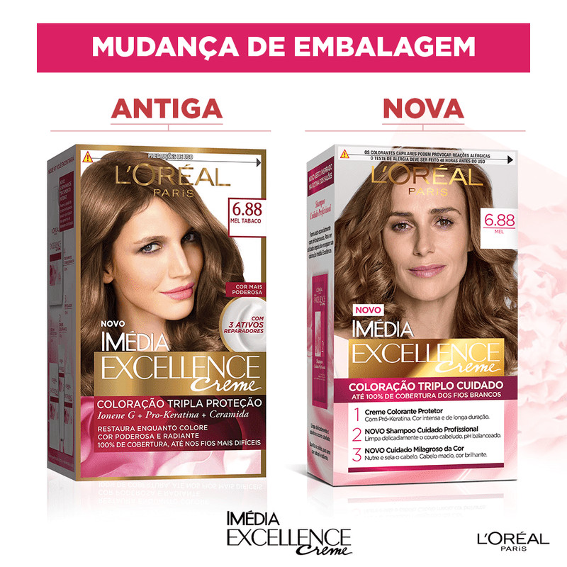 Kit Tintura Imédia Excellence é uma coloração permanente que traz uma ampla gama de cores deslumbrantes e intensas com garantia de tripla proteção para você mulher vaidosa. Revitaliza os cabelos com uma cor viva e com um brilho intenso protegendo e realçando a beleza dos fios como você sempre quis. Enriquecida com pro queratina componente hidratante que devolve aos cabelos brilho intenso e maciez. Garante cobertura total dos fios brancos podendo ser utilizada em todos os tipos de cabelo. A Tintura Imédia além de colorir de forma eficaz da raiz até as pontas protege os cabelos intensamente com seus nutrientes hidratantes inibindo o ressecamento e a quebra. Resultado de cabelos fortes, bonitos e com um tom radiante que combina perfeitamente com você. Modo de usar: Antes da coloração, aplique o serum protetor sobre as partes danificadas, comprimento e pontas, não aplicando o serum nas raízes. Aplique somente sobre os cabelos secos e não lavados. Massageie suavemente. Deixe agir por 2 minutos enquanto você prepara a mistura colorante. Coloque as luvas, desenrosque a tampa do frasco aplicador que contém o creme revelador, logo despeje todo o conteúdo do tubo colorante dentro do frasco aplicador. Feche com a tampa do frasco aplicador auto quebrável e agite bem até obter uma mistura homogênea. Quebre a ponta do frasco aplicador imediatamente após a mistura, você também pode aplicar com o pente aplicador, ele desliza facilmente sobre os cabelos permitindo uma aplicação fácil e rápida. Não enxague o serum protetor, aplique diretamente a coloração. Aplique a mistura na raiz separando mecha por mecha. Distribua o restante do produto sobre o comprimento e as pontas, termine massageando suavemente os cabelos. Deixe agir por 35 minutos, Enxague abundantemente com água morna até que a água fique clara. Aplique uma boa quantidade do tratamento condicionador sobre todo cabelo, massageie suavemente e deixe agir por 2 minutos. Depois enxague bem o cabelo novamente. Sobre a marca: A chegada da L'Oréal ao Brasil aconteceu em 1939, quando o primeiro agente comercial da empresa, o francês Maurice Bélières, chegou ao Rio de Janeiro criando a Maurice Bélières e Cia Ltda. Mas foi em 1959 que o Grupo L'Oréal se instalou definitivamente no Brasil, inicialmente com uma fábrica de 1.200 m2 e 16 colaboradores. Hoje, suas duas fábricas, uma no Rio e outra em São Paulo, representam um dos maiores e mais importantes parques industriais da L'Oréal no mundo, ocupando uma superfície de mais de 70.000 m2 de área construída. A L'Oréal estabeleceu a missão de oferecer a todas as mulheres e homens do mundo inteiro o melhor da inovação em cosmética em termos de qualidade, eficácia e segurança. Ela segue a sua meta ao atender à infinita diversidade de necessidades e desejos de beleza ao redor do mundo. A beleza é universal.