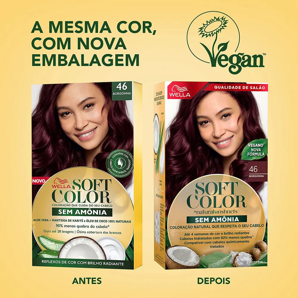 O kit Tintura Soft Color da Wella é a escolha ideal para quem busca uma coloração suave, sem amônia, com resultado natural e fios saudáveis. Sua fórmula é enriquecida com Óleo de Coco, Aloe Vera e Manteiga de Karité, promovendo hidratação, brilho e maciez durante a coloração. Proporciona cobertura uniforme, brilho radiante e neutraliza tons indesejados, como amarelado e alaranjado. Indicado para todos os tipos de cabelo, o produto garante cor vibrante por até 4 semanas e 92% menos quebra dos fios. Benefícios:• Coloração sem amônia, suave para os fios e couro cabeludo.• Até 4 semanas de cor radiante e brilho intenso.• 92% menos quebra dos fios após a coloração.• Neutraliza tons amarelados e alaranjados indesejados.• Proporciona aspecto 100% natural com cobertura uniforme.• Fórmula vegana, dermatologicamente testada e com ativos nutritivos.• Disponível em 24 tonalidades para todos os tipos de cabelo. Ativos:• Óleo de Coco – nutre, fortalece e dá brilho aos fios.• Aloe Vera – hidrata e acalma o couro cabeludo.• Manteiga de Karité – restaura a maciez e protege os cabelos do ressecamento. Modo de Uso:• Com os cabelos úmidos, misture a coloração com a emulsão ativadora do kit.• Aplique uniformemente sobre os fios, respeitando o tempo de pausa indicado na embalagem.• Enxágue completamente e aplique o condicionador de tratamento para selar a cor e garantir brilho e hidratação.• Para melhores resultados, siga rigorosamente as instruções do folheto que acompanha o produto. Sobre a marca: A Wella é referência mundial em cuidados capilares, oferecendo soluções inovadoras e profissionais há mais de 140 anos. Com a linha Soft Color, a marca reforça seu compromisso com a beleza saudável, trazendo coloração de qualidade com fórmulas veganas e sem amônia, que cuidam dos fios e realçam a beleza natural. • Realce sua beleza com a Tintura Wella Soft Color — cor radiante, sem amônia e com o cuidado que seus fios merecem!