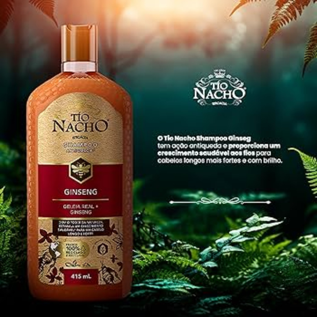 Kit Tio Nacho Ginseng Shampoo 415ml + Condicionador 415ml A linha Tio Nacho Ginseng foi desenvolvida com Geleia Real e extratos naturais para estimular o crescimento saudavel dos fios, fortalecer a fibra capilar e proporcionar cabelos longos, fortes e brilhantes. Sua formula exclusiva conta com ingredientes reconhecidos por suas propriedades hidratantes, antioxidantes e fortalecedoras, atuando desde a raiz ate as pontas. Beneficios: Estimula o crescimento saudavel dos cabelos. Fortalece a fibra capilar e reduz a quebra. Promove brilho e resistencia desde o primeiro uso. Com Geleia Real, Ginseng, Aloe Vera, Alecrim e Jojoba. Acao antiquebra e hidratacao profunda. Ativos Naturais e suas funcoes: Geleia Real: Nutre profundamente com proteinas e vitaminas. Extrato de Ginseng: Acao revitalizante e antioxidante. Aloe Vera: Fortalece e revitaliza desde a raiz. Alecrim: Auxilia no combate a queda de cabelo Jojoba: Emoliente e hidratante, ajuda na reparacao dos fios Modo de uso: Aplique o shampoo nos cabelos molhados, massageando o couro cabeludo suavemente. Enxague. Aplique o condicionador no comprimento e pontas. Deixe agir por alguns minutos e enxague bem. Para melhores resultados, utilize a linha completa Tio Nacho Ginseng. Conteudo da embalagem: 1 Shampoo Tio Nacho Ginseng 415ml. 1 Condicionador Tio Nacho Ginseng 415ml.