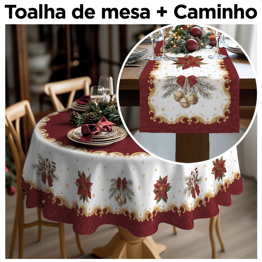 Kit Toalha de Mesa 4 Lugares Redonda Natal 1,40m + Caminho de Mesa 1,40x0,40m - Mesa Posta Natalina