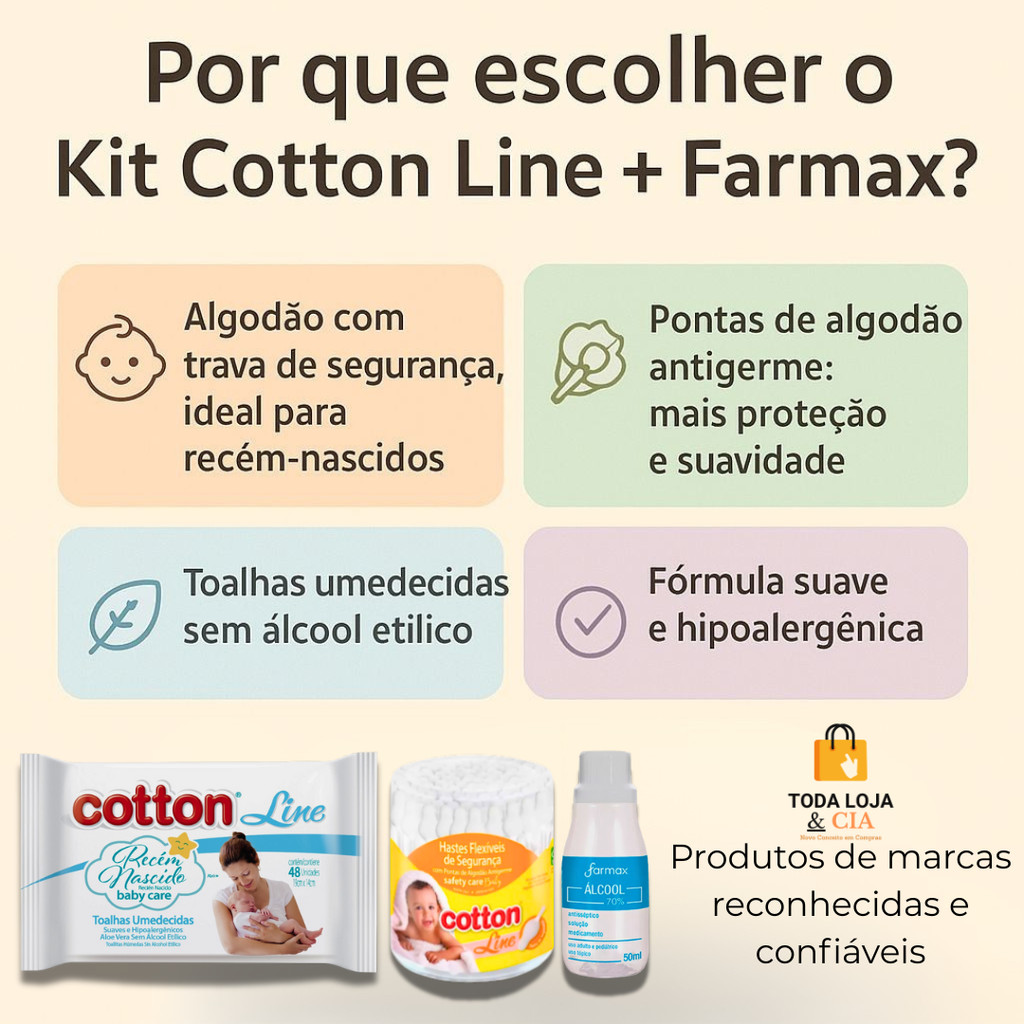 Kit Toalha Umedecida Cotonete Álcool Para Higienização Farmax Cottonline Kit Higiene Recém Nascido