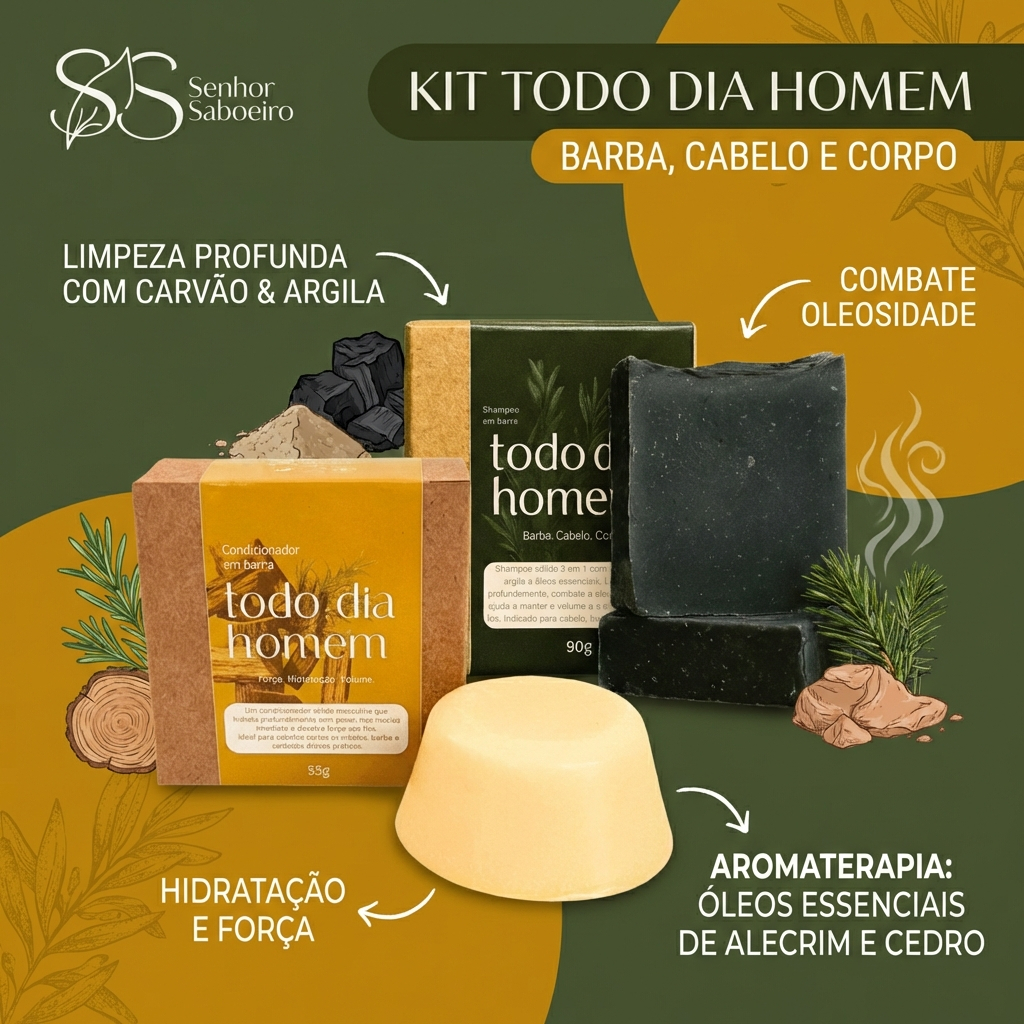 Kit Todo Dia Homem: Shampoo 3 em 1 + Condicionador Sólido Masculino - Anticaspa Volume Hidratação - Cabelo Barba Corpo