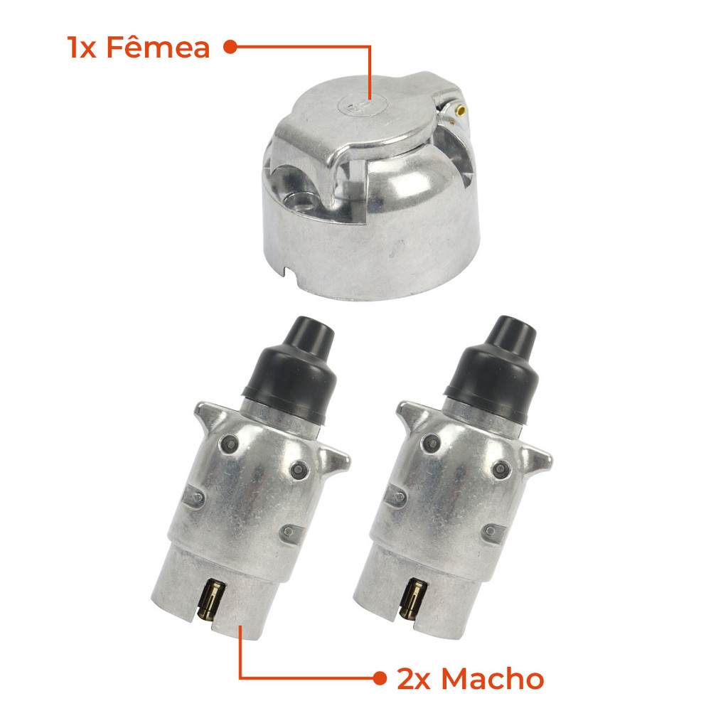 Kit Tomada Engate Reboque 2x Macho + 1x Fêmea 6 Polos Completo Alumínio Cromado Carretinha Carreta