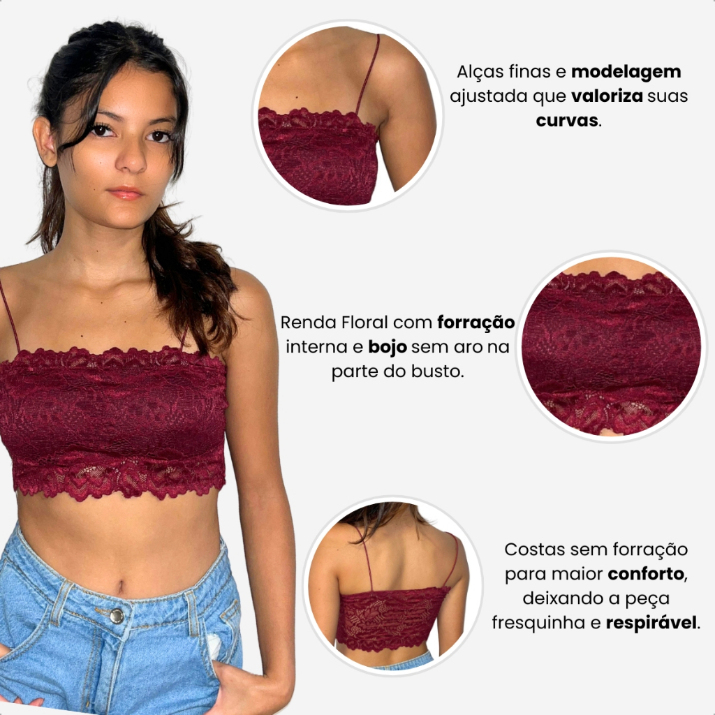 Kit Top Faixa Cropped Feminino de Renda Com Bojo Sutiã Blusinha Rendada