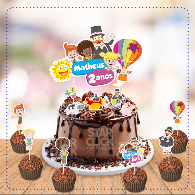 Kit Topo de Bolo + 50 Tags Toppers P/ Docinhos Mundo do Bita