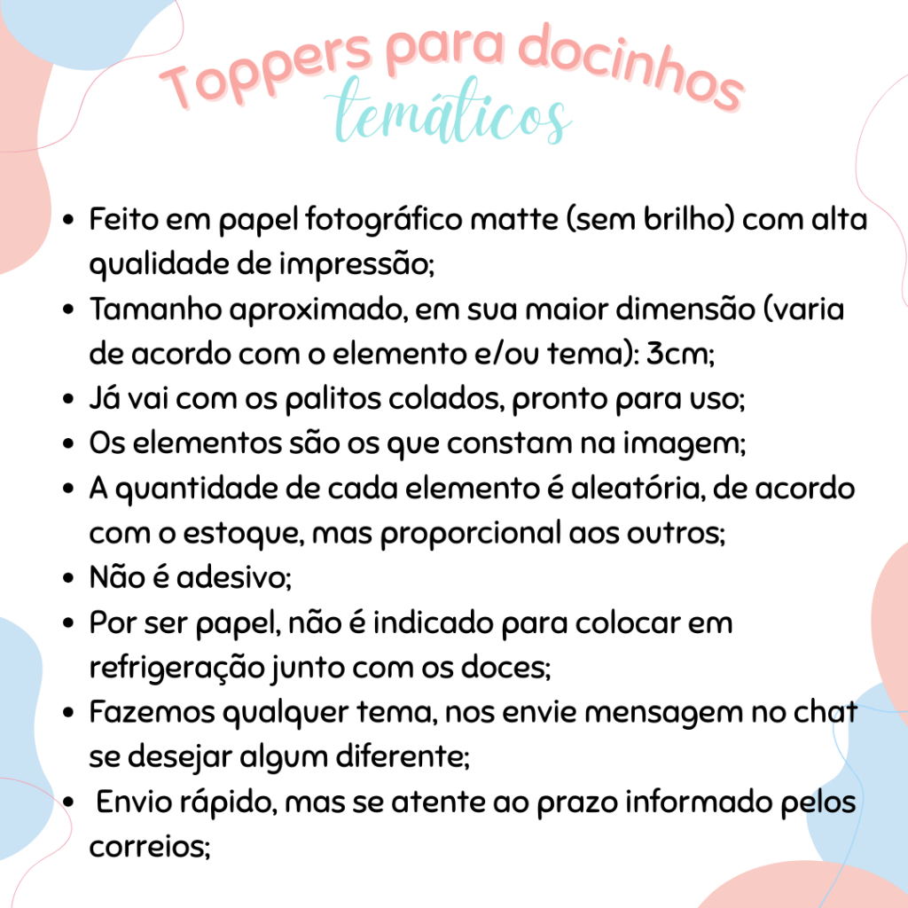 ✨Kit Topper para Docinhos Tema Dino Baby 🦕 🧁Transforme seus docinhos em parte da decoração! Deixe sua mesa ainda mais encantadora com nossos toppers de docinhos personalizados ✨. Cada detalhe é feito com carinho para transformar seus doces em verdadeiras obras de arte, deixando sua comemoração muito mais alegre, temática e cheia de charme e com aquele detalhe que faz toda a diferença!💕 Feitos em papel de qualidade e recorte preciso, os toppers já vão prontos para uso: é só aplicar nos docinhos e pronto! 🧁 Eles são o detalhe perfeito para deixar as fotos da festa inesquecíveis. ✨ Destaques do produto: - Material: Papel fotográfico matte (sem brilho); - Acabamento: Recorte eletrônico preciso; - Fixação: Palitinho transparente já aplicado, pronto para uso; - Tamanho médio de sua maior dimensão: 3 cm (pode variar conforme o tema e/ou elemento); 🧵 Produto artesanal feito com muito amor! Cada detalhe é criado com carinho para eternizar momentos únicos. ⚠️ Observações: ❌ Não comestível. ✨Não aconselhável ir para a refrigeração junto com os doces, por ser um produto de papel e sensível à umidade. 🎨 Pequenas variações nas cores podem ocorrer conforme o tipo de tela/dispositivo usado para visualização do anúncio. 📦 Envio rápido. Fique atento(a) apenas ao prazo informado pelas transportadoras no momento da compra. 💬 Ficou com alguma dúvida? Deseja outro tema? Mande uma mensagem no chat! Será um prazer te ajudar a deixar sua festa ainda mais linda e cheia de personalidade!