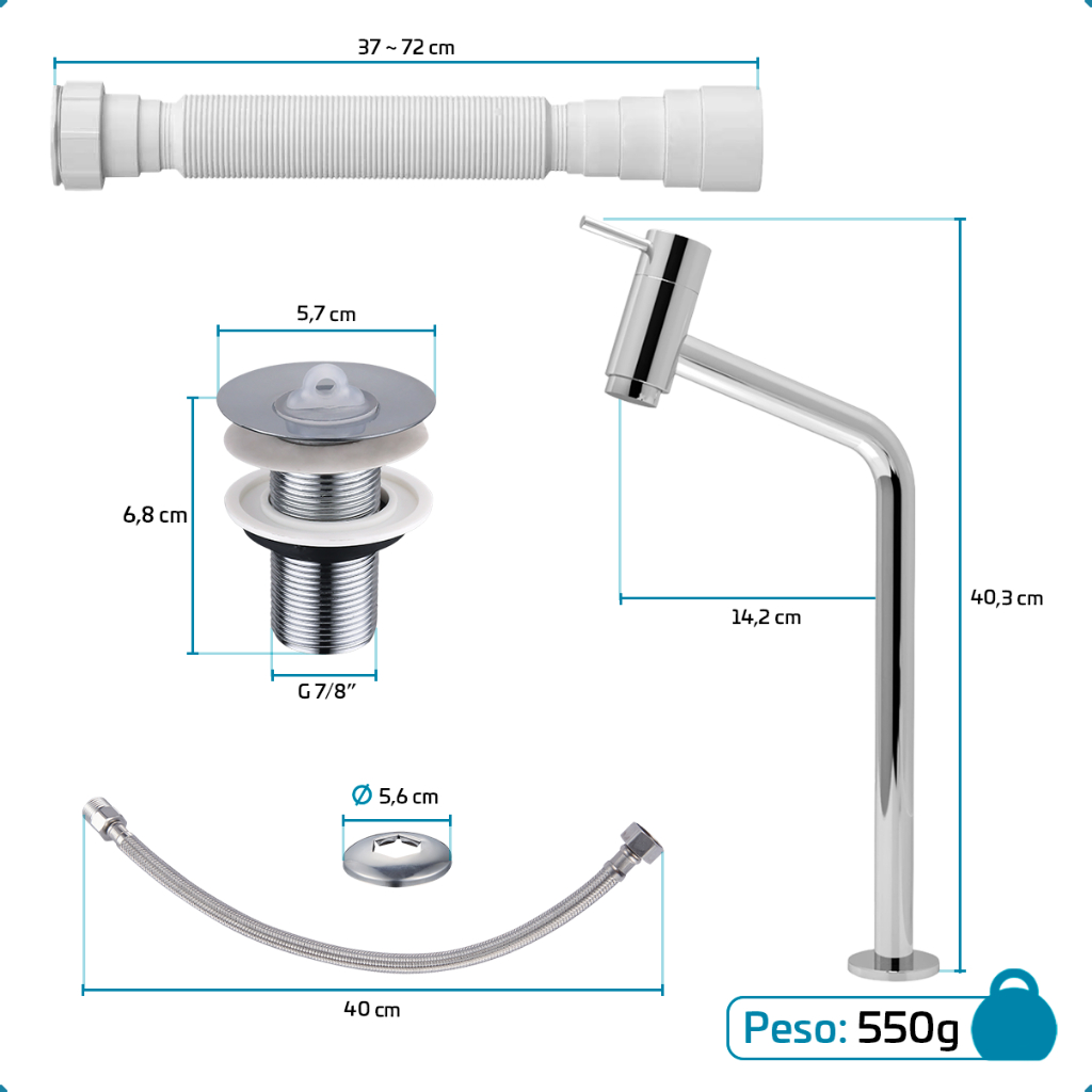 KIT PARA BANHEIRO TORNEIRA LINK BICA ALTA METAL CROMADA + VÁLVULA 7/8" METAL CROMADA + ENGATE FLEXIVEL + SIFÃO BELTEMPO. O kit para banheiro e lavabo da Beltempo é o que você procura para o seu banheiro, o kit conta com Torneira link bica alta, válvula 7/8”, sifão e engate flexível. É a escolha ideal para quem busca a solução completa. PRINCIPAIS CARACTERÍSTICAS: - Embalagem com proteção extra para transporte. - Produto de alta qualidade com excelente acabamento. - Torneira link 45° com bica móvel acionamento ¼” de volta e arejador. - Válvula em metal resistente, garantindo maior durabilidade. - Engate flexível resistente e anticorrosivo, compatível com diversos tipos de instalação. - Sifão universal em peça única evitando vazamentos. ITENS INCLUSOS: - 01 Torneira link 45° bica alta cromada. - 01 Válvula padrão 7/8” cromada - 01 Engate flexível cromado - 01 Sifão universal branco INFORMAÇÕES TÉCNICAS: - Marca BELTEMPO TORNEIRA LINK BANHEIRO MESA BICA ALTA 45° METAL CROMADA BELTEMPO - Tipo: Mesa Link Bica Alta - Acionamento: Manual 1/4 de volta - Material: Metal - Acabamento/cor: Cromada - Bica móvel com giro 360°. - Bitola da rosca de entrada de água: G ½’’ - Água fria. - Arejador: Sim - Acompanha: Canopla, rosca de fixação e anel de vedação. - Altura Total: 43,0 cm - Altura da Bica: 28,5 cm - Avanço Da Bica: 14,2 cm. - Largura: 1,5 cm - Furo de Instalação: 3 cm - Peso: 259g VÁLVULA PADRÃO 7/8" RALO CUBA PIA METAL CROMADA BELTEMPO - Tipo: Padrão - Material: Metal - Acabamento/cor: Cromado - Bitola da rosca de saída: 7/8’’ - Acompanha: Rosca de fixação, arruela, anel de vedação e tampa. - Altura da rosca: 6,8 cm - Diâmetro superior (encaixe na pia): 5,7 cm - Diâmetro Inferior: (rosca de saída): 3,0 cm - Furo de Instalação: 3,5 cm - Peso: 78 g ENGATE FLEXIVEL MANGUEIRA 40CM AÇO INOX CROMADA BELTEMPO - Tipo: Convencional - Material: Aço Inox - Acabamento/cor: Cromado - Bitola das roscas de entrada de água: G 1/2’’ - Água fria. - Acompanha: Canopla. - Comprimento: 40 cm - Peso: 113 g SIFÃO SANFONADO 72CM UNIVERSAL BRANCO BELTEMPO - Material: Polipropileno - Cor: Branco - Resistente à temperaturas de -20°C à +90°C - Comprimento mínimo: 37cm - Comprimento máximo: 72cm - Entradas: 1" (29,5mm), 1.1/4" (42mm), 1.1/2" (48mm) - Saídas: DN 38mm, DN 40mm, DN 48mm, DN 50mm GARANTIA: Torneira, válvula, engate e sifão BELTEMPO - 12 MESES DICA DE LIMPEZA: Para limpar o kit utilize um pano macio. Se necessário, use detergente ou sabão neutro com um pano umedecido. Enxágue bem e seque com um pano seco. (Nunca utilize palha de aço, produtos abrasivos, químicos ou solventes para a limpeza). A Beltempo possui uma linha completa de cubas, torneiras, válvulas, sifões e engates flexíveis. Consulte-nos para mais informações! DÚVIDAS FREQUENTES: 1. Qual o material da torneira? A torneira é feita de metal. 2. Essa torneira serve para lavatórios padrão? Sim, ela foi projetada para ser compatível com pias padrão, encaixando-se perfeitamente em lavatórios comuns. 3. A torneira possui misturador para água quente e fria? A torneira não possui sistema de misturador quente e frio. 4. A bica da torneira é móvel? Sim, a bica é móvel em 360°, garantindo praticidade no dia a dia. 5. O bico arejador da torneira é móvel? O bico arejador da torneira é fixo, mas pode ser removido para limpeza. 6. A torneira economiza água? Sim, graças ao arejador embutido, a torneira reduz o consumo de água sem comprometer o fluxo, tornando-a uma opção econômica e sustentável. 7. Funciona bem em sistemas de baixa pressão? Sim, a torneira foi desenvolvida para funcionar perfeitamente mesmo em sistemas de baixa pressão, oferecendo um fluxo de água consistente. 8. Qual o material da válvula? A válvula é feita em metal com acabamento cromado, garantindo alta durabilidade e resistência. 9. Essa válvula serve para lavatórios padrão? Sim, ela foi projetada para ser compatível com pias padrão, encaixando-se perfeitamente em lavatórios comuns. 10. Qual o material do engate flexível? O engate flexível é feito em aço inox com acabamento cromado. 11. O engate funciona bem em sistemas de baixa pressão? Sim, o engate flexível foi desenvolvido para funcionar perfeitamente mesmo em sistemas de baixa pressão, oferecendo um fluxo de água consistente. 12. É fácil de limpar? Sim, o design do kit facilita a limpeza. Além disso o arejador da torneira pode ser retirado e limpo regularmente. 13. Qual a garantia do produto? A torneira, válvula engate e sifão possuem 12 meses de garantia, proporcionando segurança para sua compra. 14. O acabamento descasca com o tempo? O acabamento é resistente a desgastes e mantém sua aparência impecável, desde que siga as orientações de limpeza adequadas. (Nunca utilize palha de aço, produtos abrasivos, químicos ou solventes para a limpeza). 15. O kit é compatível com aquecedores de água? Não.