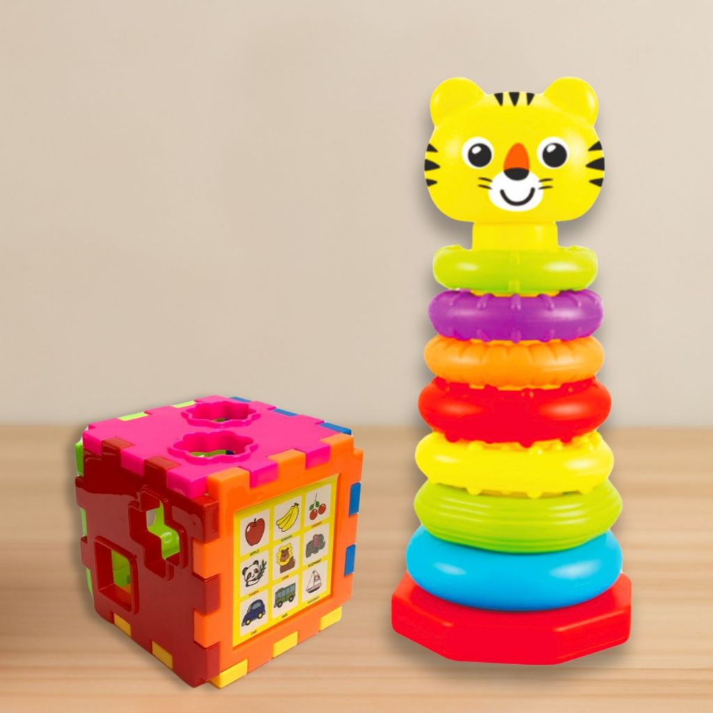 KIT Torre Argola + Cubo Didático Brinquedo Educativo Sensorial Encaixe Torre Divertida Colorida Bebe