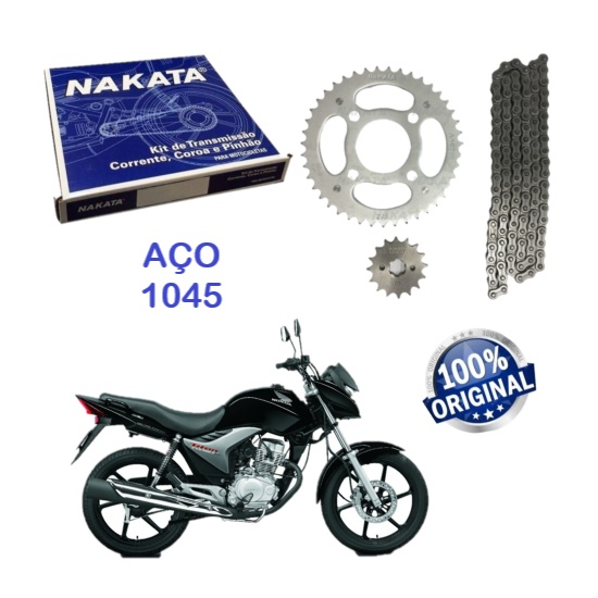 PRODUTO COM NOTA FISCAL ORIGINAL NAKATA NOVA PRODUTO NOVO EM SUA EMBALAGEM ORIGINAL 1 - KIT DE RELAÇÃO ( 1 COROA 43 DENTES, 1 PINHÃO 16 DENTES, 1 CORRENTE 428X118 ) NAKATA: TM10120 A Nakata, fabricante de autopeças com uma linha completa de componentes para suspensão, transmissão, freios e motor, disponibiliza ao mercado de reposição novos kits de transmissão, compostos por coroa, pinhão e corrente, para motocicletas. Com pioneirismo, qualidade e compromisso com o mercado. APLICAÇÃO HONDA Cg 150 Titan Fan 150/160 Start Todas Originais Titan 150 2004 Até 2008 Carburada Titan 150 2009 Até 2015 Injetada Fan 150 2009 Até 2015 CG 150 ES KS 2004 - 2008 ESD 2004 - 2016 MIX FAN 2009 - 2015 TITAN 160 / FAN 160 - ANO 2016 A 2020 CG 160 START 2016-2018 Conteúdo da Embalagem: • 01 Pinhão 16 Dentes. • 01 Coroa 43 Dentes. • 01 Corrente 428hx118l. Informações Importante: Recomendamos que os produtos sejam instalados por profissionais especializados; Trabalhando só com as melhores marcas do mercado. Sempre com Qualidade e Garantia. * Produtos Novo * Foto original do produto. * Enviamos para todo o Brasil. * Retirar todas as dúvidas no campo de perguntas. * Garantia. * Devolução Somente com a caixa e mercadoria em perfeito estado. * Para GARANTIA ou DEVOLUÇÕES o produto deve retornar ao vendedor com as caixas originais do produto sem estar danificadas, sujas ou rasgadas. ”Então guarde bem a embalagem com cuidado ate o termino do tempos de garantia” O produto em caso de garantia será enviado ao fabricante para analise de ate 30 dias.