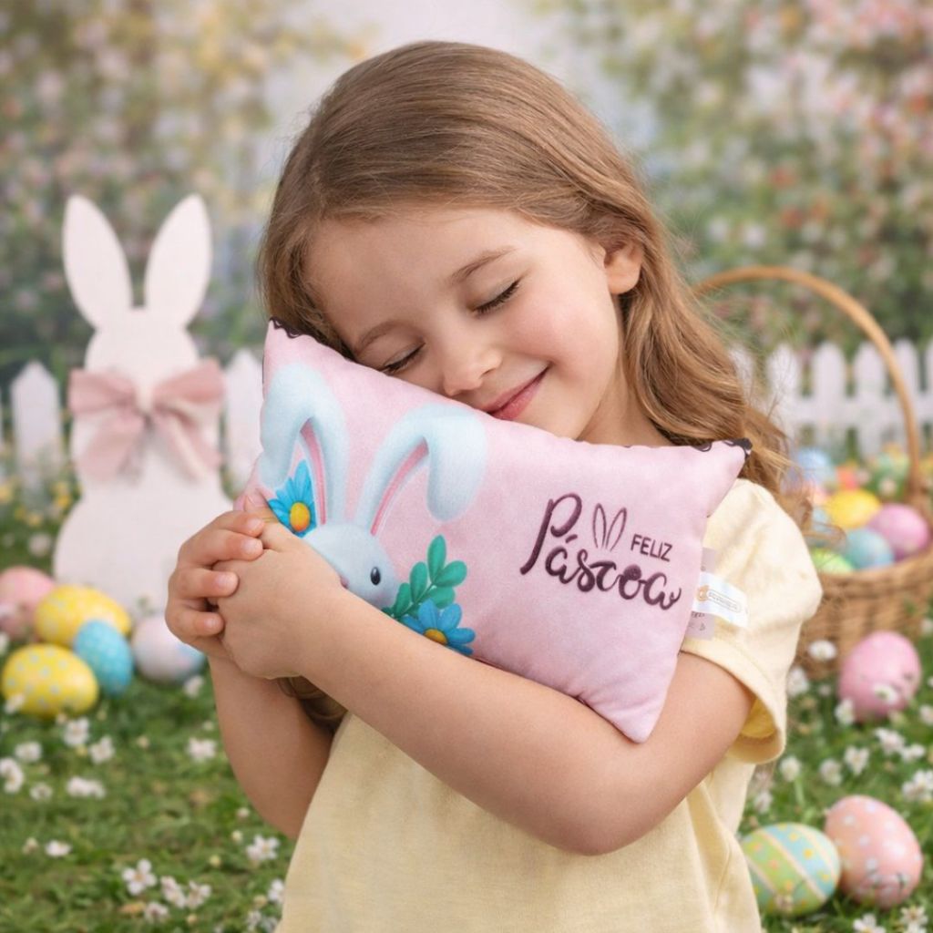 Kit Travesseiro Mini Páscoa Com Caneca 350ml Café Chá Feliz Páscoa Coelhinho Fofinho Decorativo Presente Amigos Família