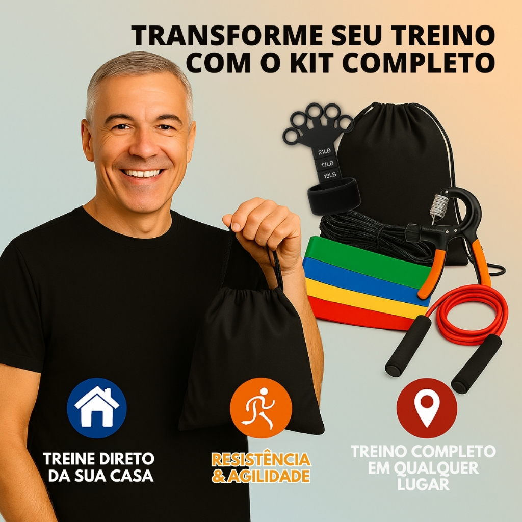 🔥 Monte sua academia em casa com praticidade e resultados reais! Treine onde e quando quiser com nossos kits completos de treino funcional. Escolha a variação ideal e receba os acessórios certos para melhorar sua força, resistência, emagrecimento e reabilitação. ✅ O que você recebe em cada KIT: (Cada foto de capa das variação específica detalhadamente os itens que você recebe ao comprar!) 🔹 Kit Completo Kit Elástico Extensor + Miniband + Corda de Pular + Hand Grip + Exercitador de Dedos ➡ Ideal para quem busca um treino 100% completo: força, cardio, coordenação e fortalecimento das mãos. 🔹 Kit Power Kit Elástico Extensor + Miniband + Corda de Pular + Hand Grip ➡ A escolha perfeita para quem treina com intensidade e quer resultados rápidos. 🔹 Kit Fitness Kit Elástico Extensor + Miniband + Corda de Pular ➡ Emagreça, tonifique e melhore o condicionamento físico com os acessórios certos. 🔹 Kit Força Kit Elástico Extensor + Miniband + Hand Grip ➡ Trabalhe braços, pernas e mãos com resistência progressiva. 🔹 Kit Básico Kit Elástico Extensor + Miniband ➡ Comece hoje mesmo! Ideal para iniciantes, mobilidade e fortalecimento. 🔹 Kit Elástico Apenas o Kit Elástico Extensor ➡ Essencial para treino rápido e eficaz em qualquer lugar.