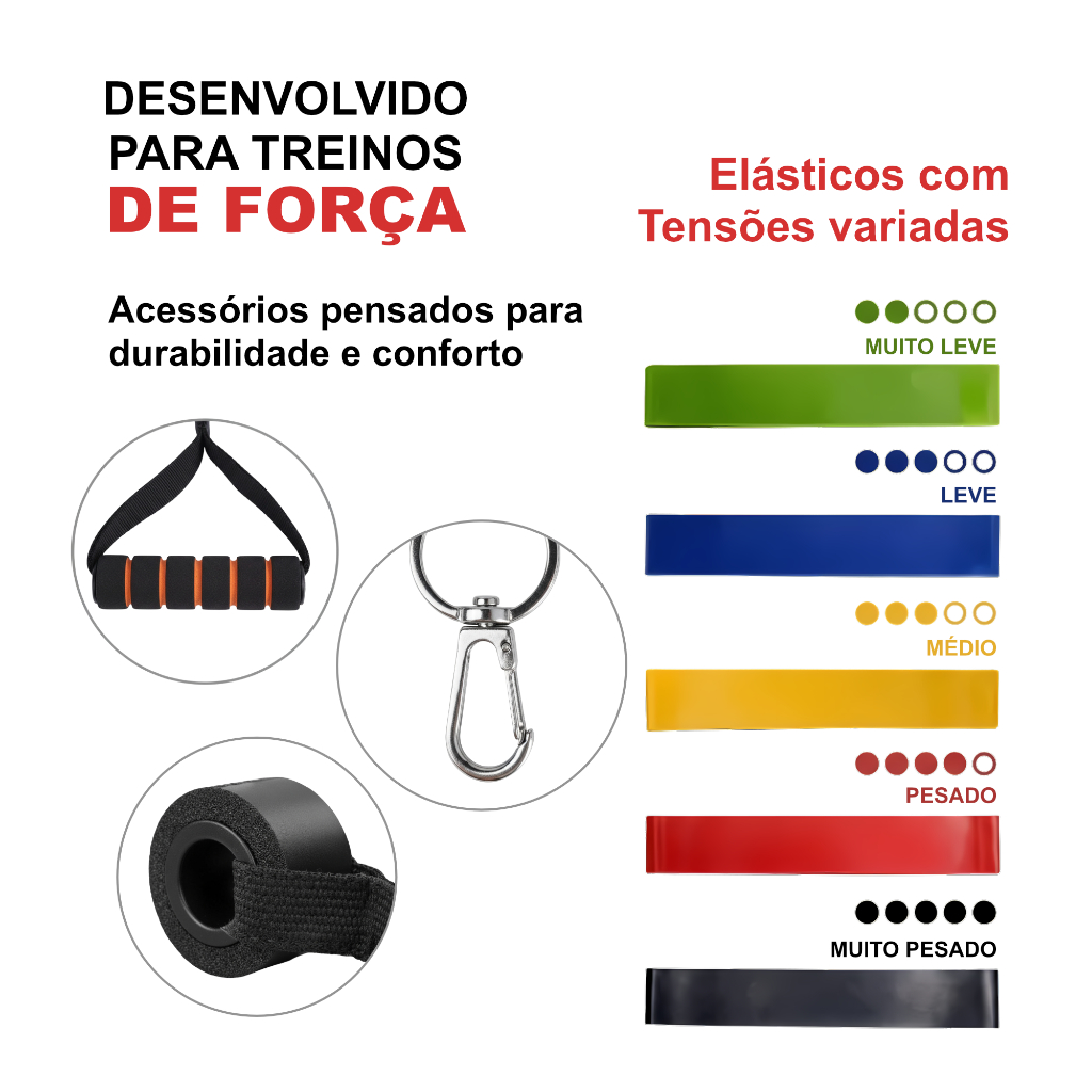 ** OBSERVAR QUE O ANÚNCIO POSSUÍ 5 VARIAÇÕES DIFERENTES, DESDE 11 ATÉ 18 ITENS ** **CLICAR NA FOTO, EM VARIAÇÕES ABAIXO, PARA ESCOLHER A OPÇÃO DESEJADA** >>> KIT[A] : 11 ELÁSTICOS + 5 MINI BAND + 1 HANDGRIP + 1 EXTENSOR >>> KIT [B] : 11 ELÁSTICOS + 5 MINI BAND >>> KIT [C] : 11 ELÁSTICOS + HANDGRIP + EXTENSOR >>> KIT [D] : 11 ELÁSTICOS >>> KIT [E] : CORDA DE PULAR + 5 MINI BAND + ELÁSTICO CROSS TUBE Saudações, querido cliente da loja Epikos, onde a qualidade e a confiabilidade caminham juntas. Você está prestes a descobrir algo extraordinário: o Kit 18 Itens Treinos em Casa, uma revolução para sua rotina de exercícios! BENEFÍCIOS: Conveniência: Treine qualquer grupo muscular em qualquer lugar, de casa ao parque. Variedade: Explore uma ampla gama de exercícios e intensidades. Resultados visíveis: sinta-se mais forte, energizado e confiante em seu corpo e mente. ITENS INCLUSOS: 1. ELÁSTICOS EXTENSORES ( Kit com 11 peças) - Quantidade: 5 extensores. - Tensões Variadas: Cada extensor oferece uma resistência específica, variando de 4,5 kg até 13,6 kg, permitindo a criação de treinos progressivos e adaptáveis. - Componentes Adicionais: Puxadores ergonômicos para uma pegada confortável e segura, alças ajustáveis para punho ou tornozelo para maior variedade de exercícios, âncora de porta para ancoragem segura, e uma bolsa para facilitar transporte. - Material: Fabricados para durar, oferecendo resistência e conforto durante o uso. - Guia de Exercícios: Exclusivo, para inspirar e guiar seus treinos. 2. MINIBANDS ( 5 faixas ): - Faixas Elásticas de Diferentes Intensidades: De "leve" (1,8 kg) a "pesado 2" (13,0 kg), para adaptar-se a diferentes exercícios e níveis de aptidão. - Material Durável: Feitas para resistir ao estiramento contínuo, mantendo a integridade e resistência. - Bolsa Portátil: Permite que você leve suas mini-bands para qualquer lugar de maneira prática e organizada. 3. EXTENSOR DEDOS: -O Extensor de Dedos para Fisioterapia e reabilitação, irá auxiliar na recuperação de pequenas lesões além de ser ótimo para pessoas com problemas de má articulação, através de movimentos de abrir e fechar os dedos e as mãos. 4. HANDGRIP: - Regulação de Intensidade: Possui um espectro de ajuste de 5kg até 60kg, permitindo o desenvolvimento gradual da força de preensão. - Design Confortável: Construído com 16cm de altura e 11cm de comprimento, permite um uso confortável e seguro para todas as mãos. - Material Robusto: Projetado para oferecer durabilidade e uma resistência consistente ao longo do tempo. Garantimos a qualidade e a excelência de nossos produtos com uma garantia de 30 dias contra defeitos de fabricação. Sua satisfação e confiança são nossa prioridade número um!