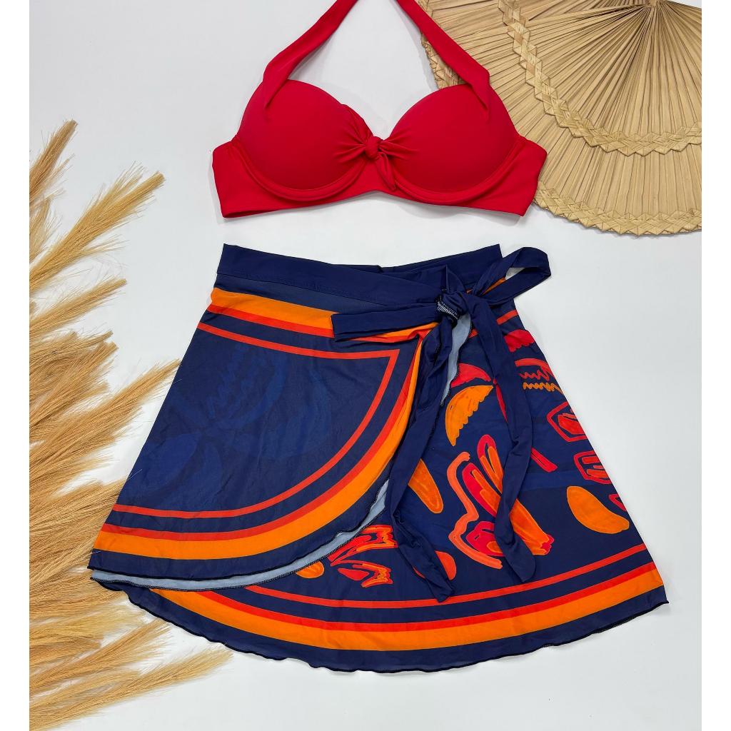 kit trikini com top bojo calcinha bombom borboleta, saia envelope pareo curta natação saida de praia