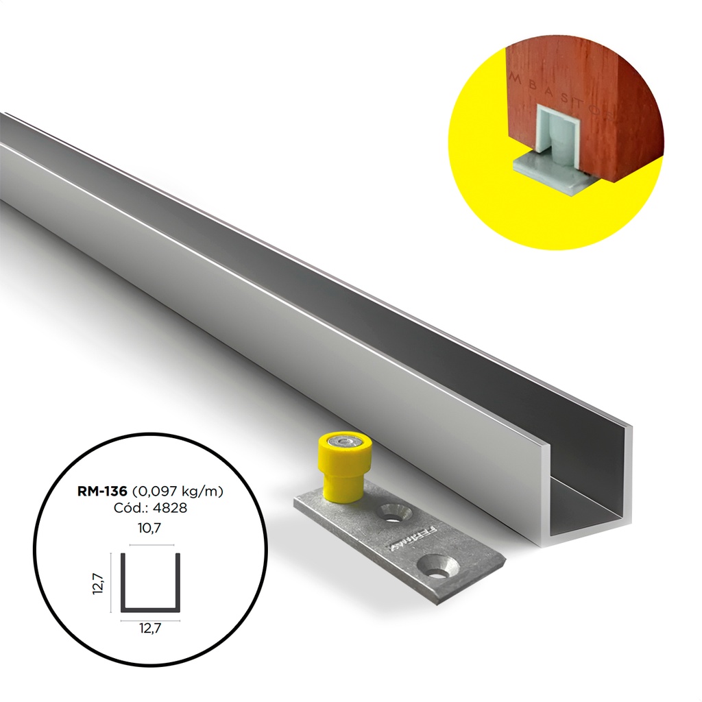 Kit Trilho U Canaleta de Embutir RM-136 com Pino Guia 9mm para Porta de Correr Guarda Roupa 1 Metro Rometal