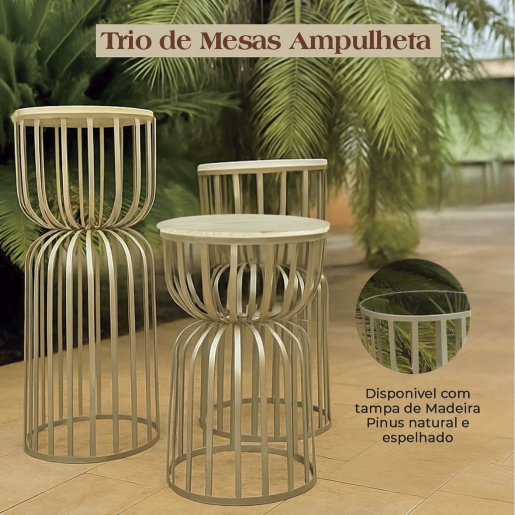 TRIO DE MESAS AMPULHETA PRADA COM TAMPO MADEIRA PINUS Ideal para Pegue E Monte, decorações de festas de casamento, aniversários e decorações em Geral MATERIAL DO PRODUTO: - Fabricada em aço carbono com solda MIG – durabilidade e resistência. - Pintura eletrostática – ótimo acabamento e proteção contra ferrugem. - Tampo com madeira pinus - Compacto, desmontável e fácil transporte DIMENSÕES DO PRODUTO: Mesa G: 90cm Altura x 36cm Largura Mesa M: 75cm Altura x 36cm Largura Mesa P: 60cm Altura x 36cm Largura; CUIDADOS E MANUTENÇÃO: Para limpeza, utilize sabão ou detergente neutro com esponja macia. Não usar solventes, objetos cortantes ou abrasivos. Não deixar exposta a situações climáticas adversas por longos períodos. IMPORTANTE: Imagens meramente ilustrativas. As cores podem sofrer variações de tonalidade de acordo com a configuração da sua tela.